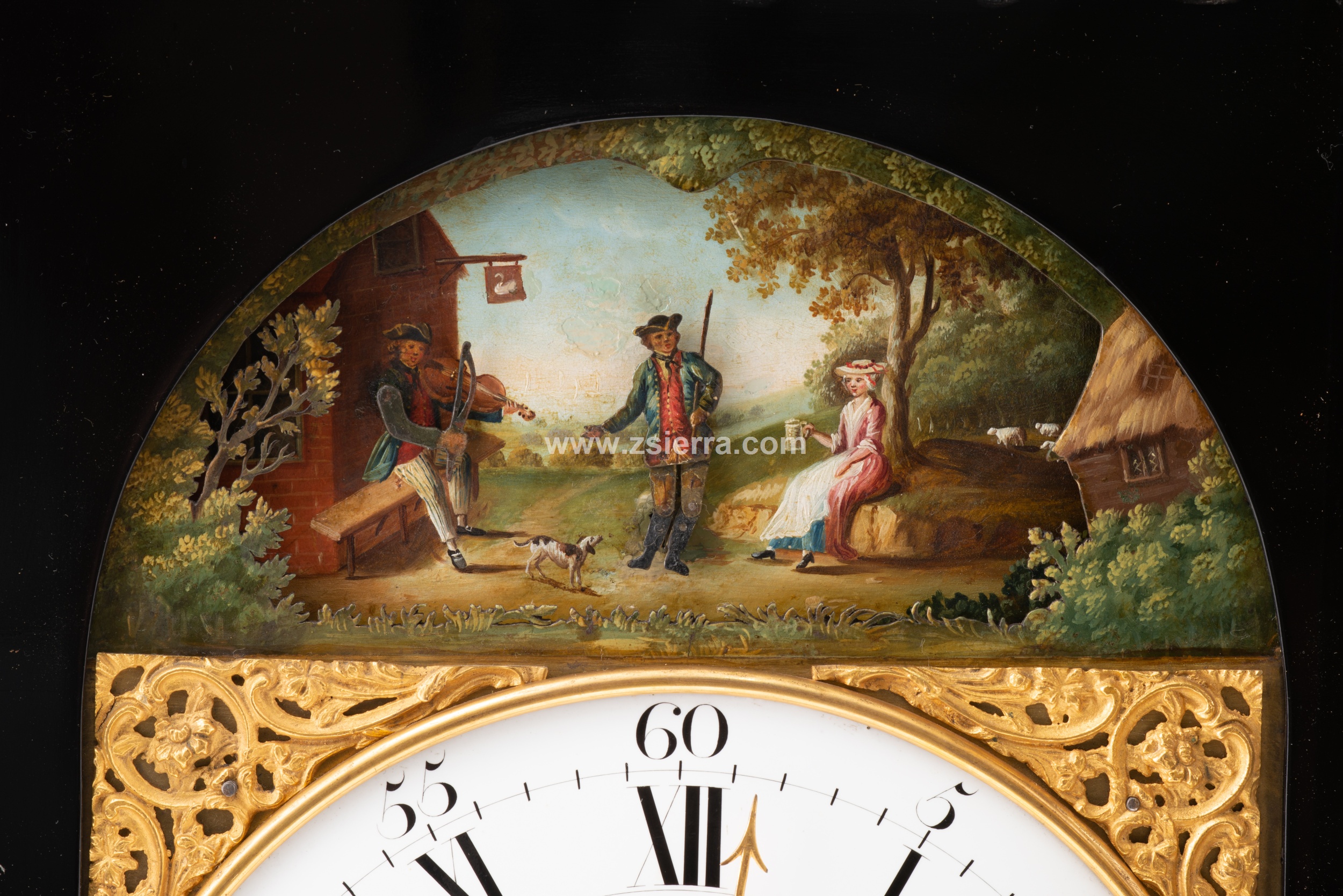 El reloj presenta una caja lacada con aplicaciones de bronce dorado y una estructura arquitectónica con estípites femeninas, etc. en un estilo que mezcla elementos de clara influencia clasicista con detalles que recuerdan más a lo rococó, celosías de bronce, cúpula, etc. Al frente presenta una puerta con vidrio transparente para proteger tanto un espacio con los autómatas, campesinos en un entorno natural, como la esfera situada debajo. Esmaltada en blanco, la esfera tiene la firma Spencer & Perkings (y el lugar de fabricación, “London”) y números romanos para las horas y arábigos cada cinco para los minutos en la zona exterior; bajo esta esfera y también esmaltadas en blanco hay otras dos esferas más pequeñas, a la izquierda para que se vea si está en modo sonoro o mudo y la de la derecha notificando si está puesta la canción, solo marcha, etc. Al dorso, en una placa grabada con elementos vegetales se presenta también el nombre de la firma que creó la pieza y el lugar.