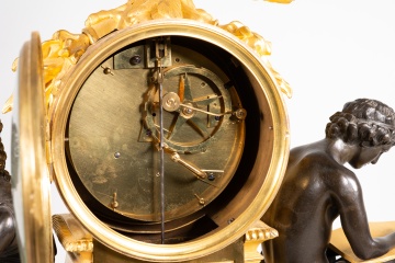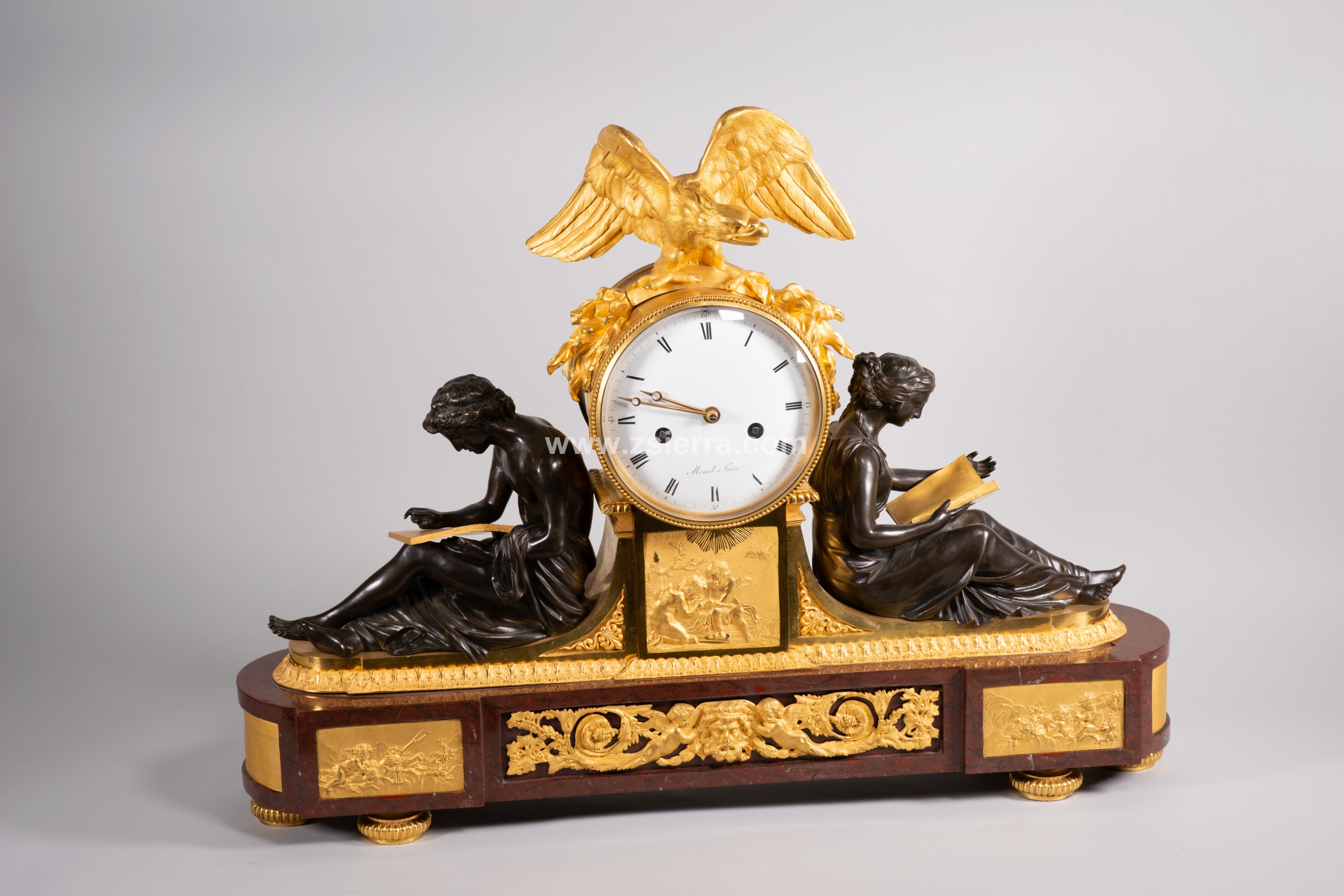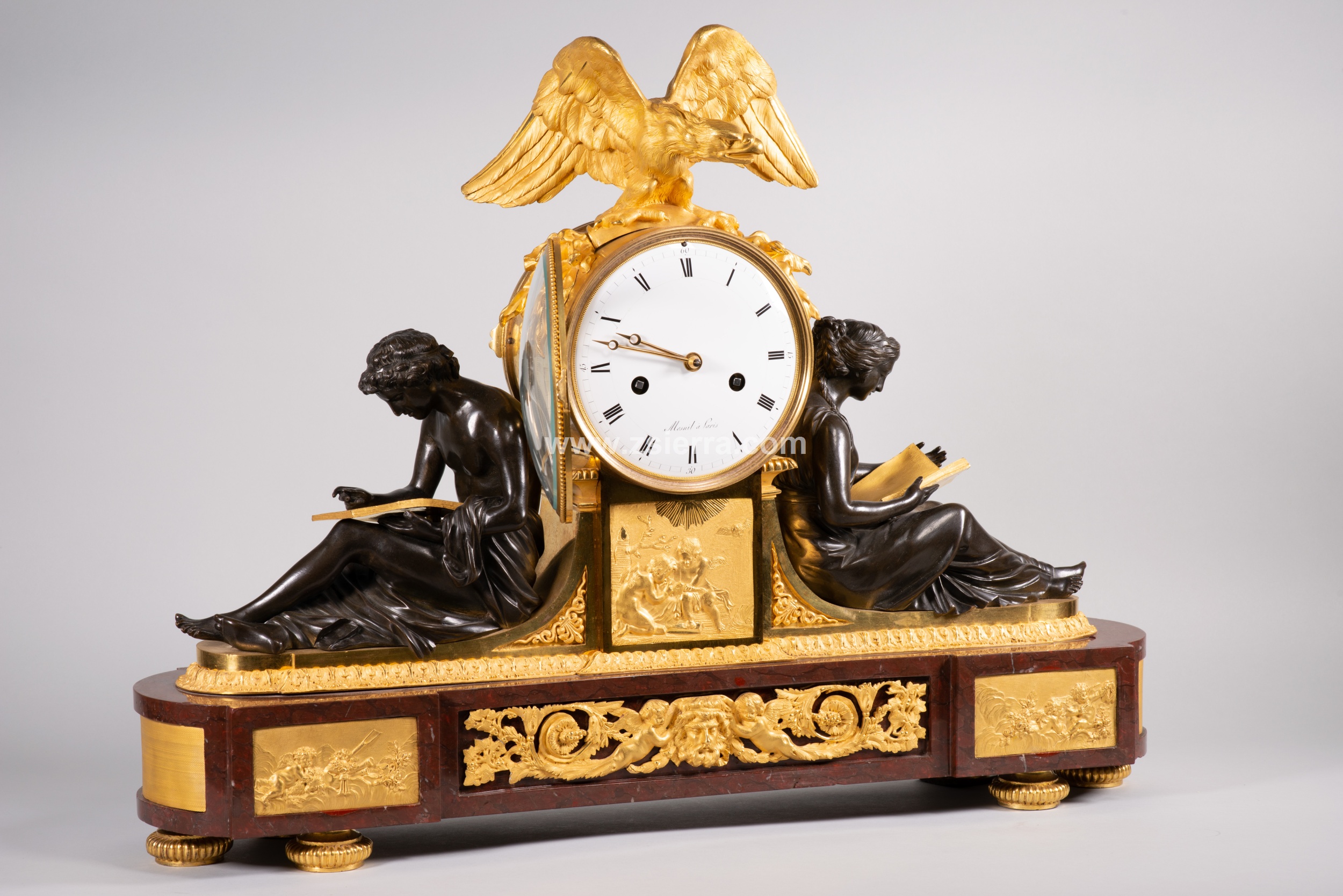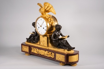 Reloj de mesa con base de mármol Rouge Griotte realzado con varios relieves en bronce sobredorado en el frente (al centro y calada, una composición simétrica con mascarón flanqueado por grutescos vegetales; dos placas con niños en distintas actitudes), dejando áreas doradas sin relieves en el resto de esta zona. Alzada ligeramente sobre patas en forma de disco, cuenta con una serie de figuras en torno a la esfera del reloj, ésta blanca, con numeración en romanos para las horas, agujas tipo breguet y la firma del relojero (Mesnil à Paris), y situada sobre un pedestal cuadrado con un relieve en el frente (de nuevo, figuras infantiles) y con un águila posada en ella (el animal se encuentra abriendo las alas y sosteniendo con sus garras una pieza tubular que la que parecen surgir rayos). Flanqueando este elemento central, aparecen dos figuras vestidas a la manera antigua.