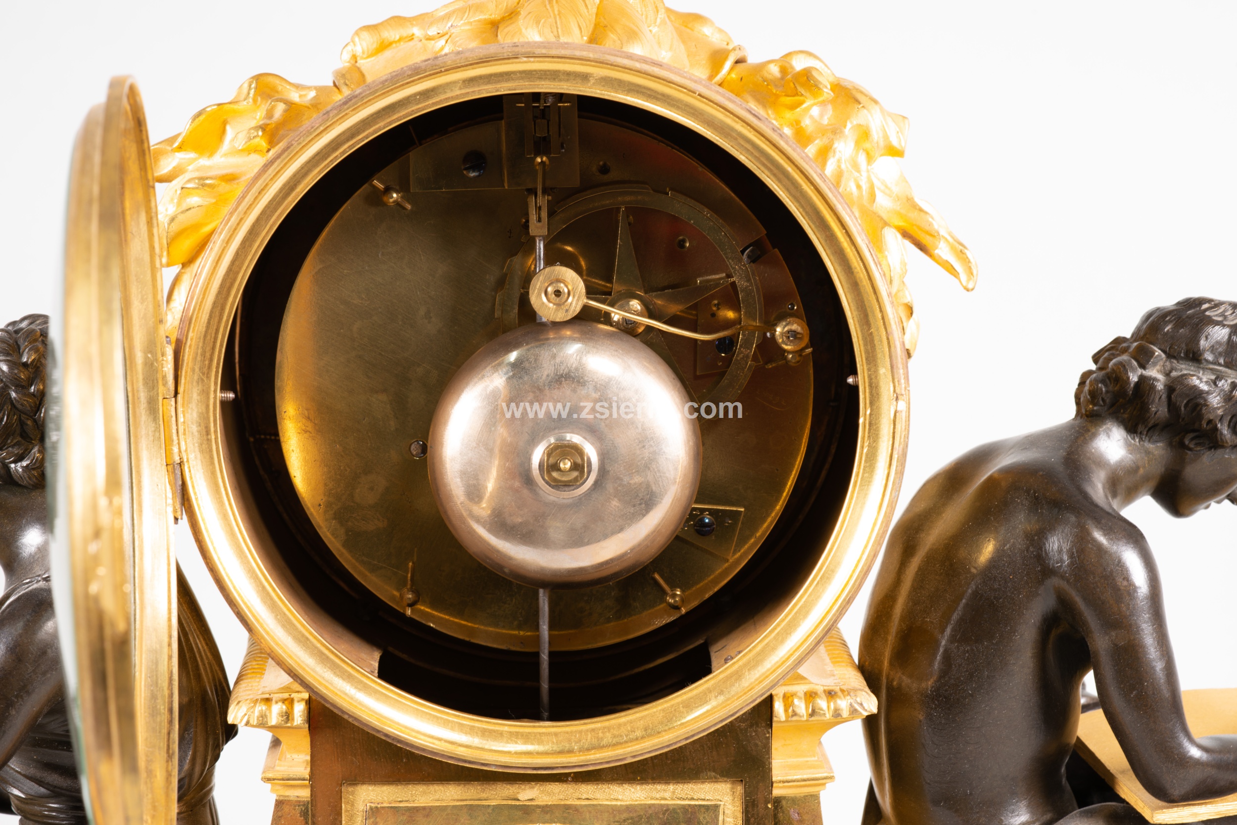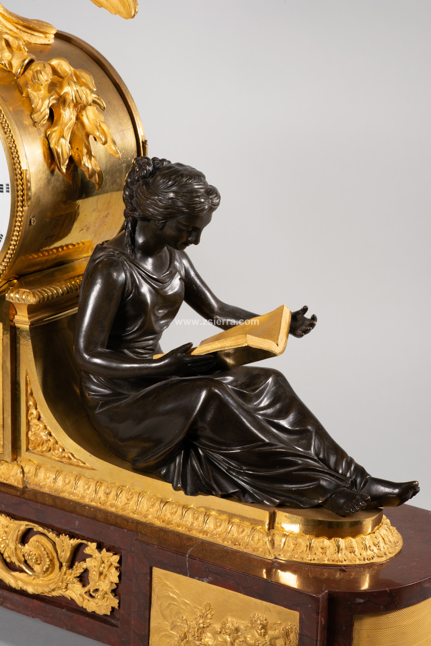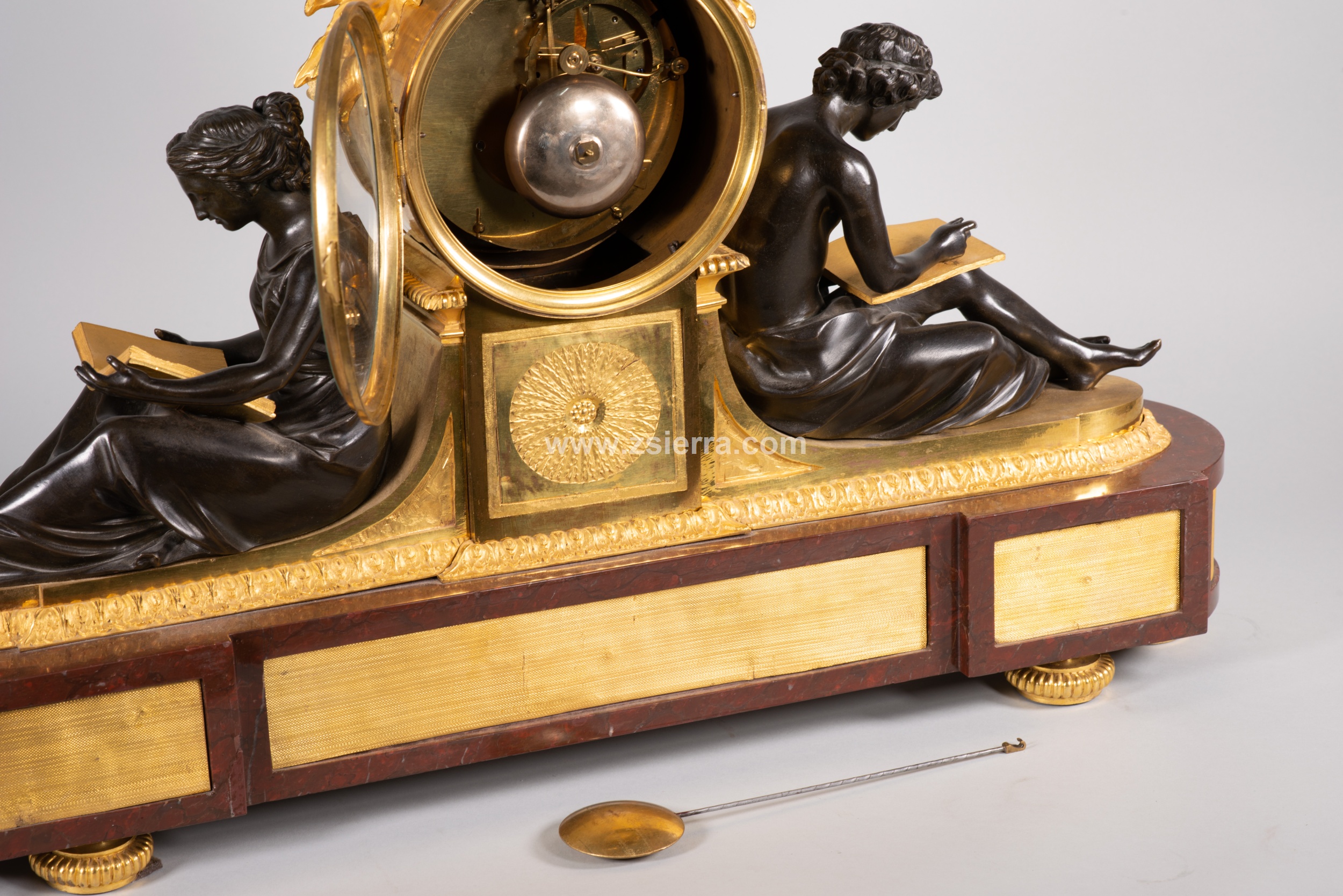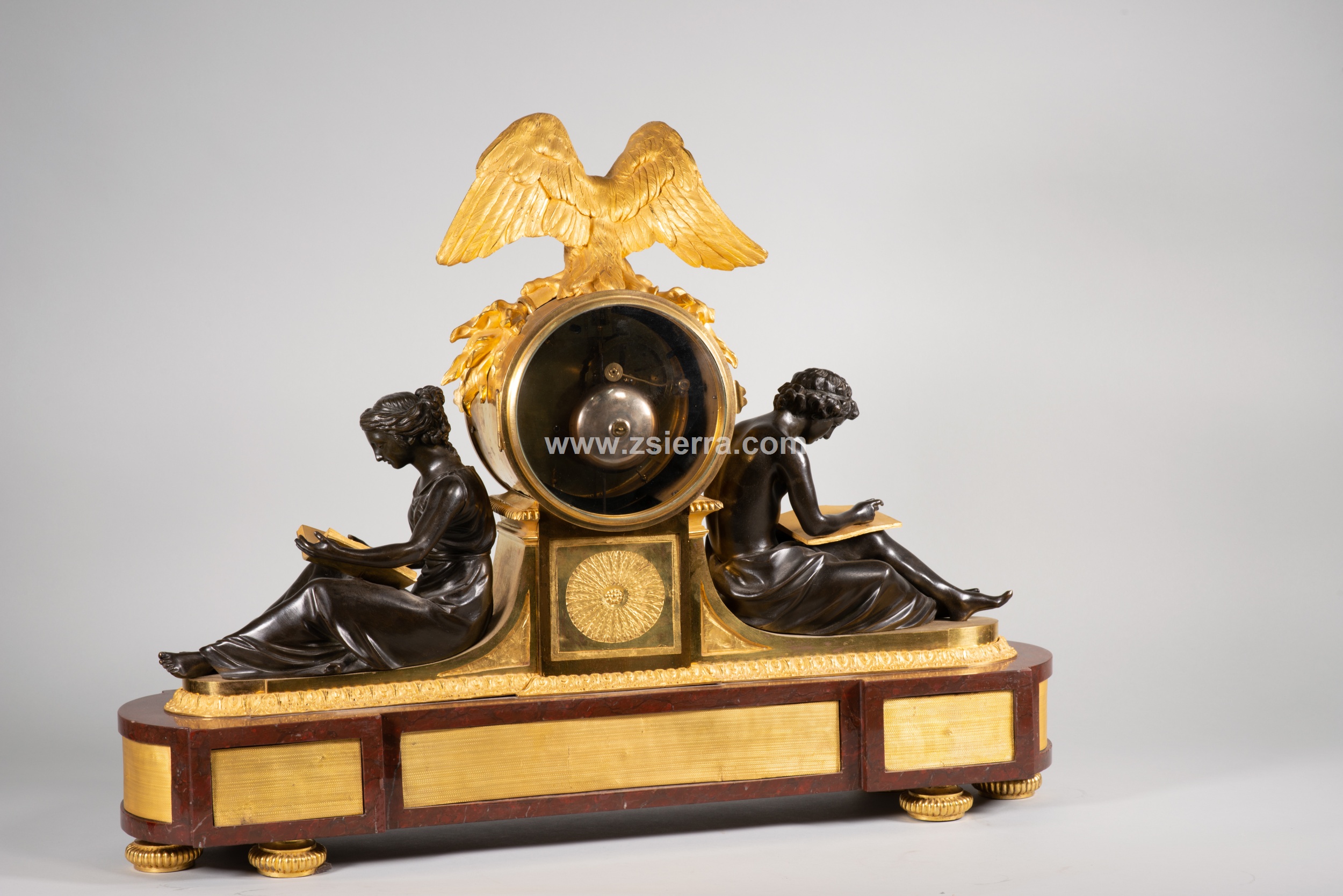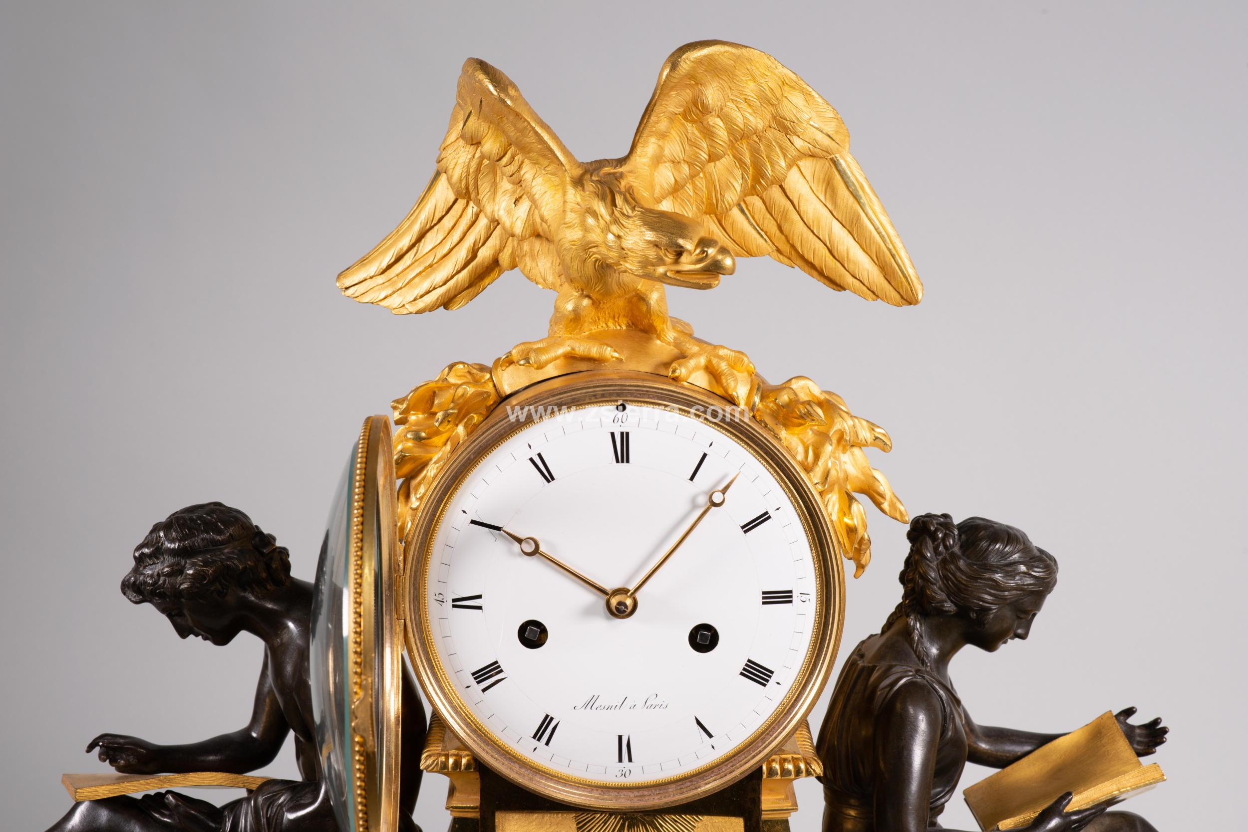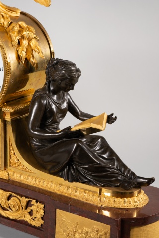 Estos dos personajes sentados están realizados en bronce pavonado y se basan en dos figuras creadas por Louis-Simon Boizot (Francia, 1743-1809) para la Fábrica de Sèvres en 1780. Conocidas como “L’Etude” (la dama con el libro, El Estudio) y “La Philosophie” (el joven con la tabla, La Filosofía), fueron también realizadas en bronce sobredorado y pavonado por François Remond (Francia, ca. 1747-1812), y montadas en relojes de mesa encargados por el “marchand-mercier” Dominique Daguerre, quien parece ser que pidió que las figuras estuvieran apoyadas contra un pedestal para el movimiento y que ella esfera estuviera reamtada por un águila. No obstante, fue una composición que gozó de una fama importante, pudiendo encontrar interesantes variaciones realizadas por otros maestros entre finales del siglo XVIII y el siglo XIX. Compárese, por ejemplo, con el conservado en el Palacio de Versalles, el que está en el Hermitage de San Petersburgo, otro en el Palacio del Quirinal, o el que pertenece al Museo del Prado de Madrid y está en depósito en la Embajada de España ante la Santa Sede (Roma).