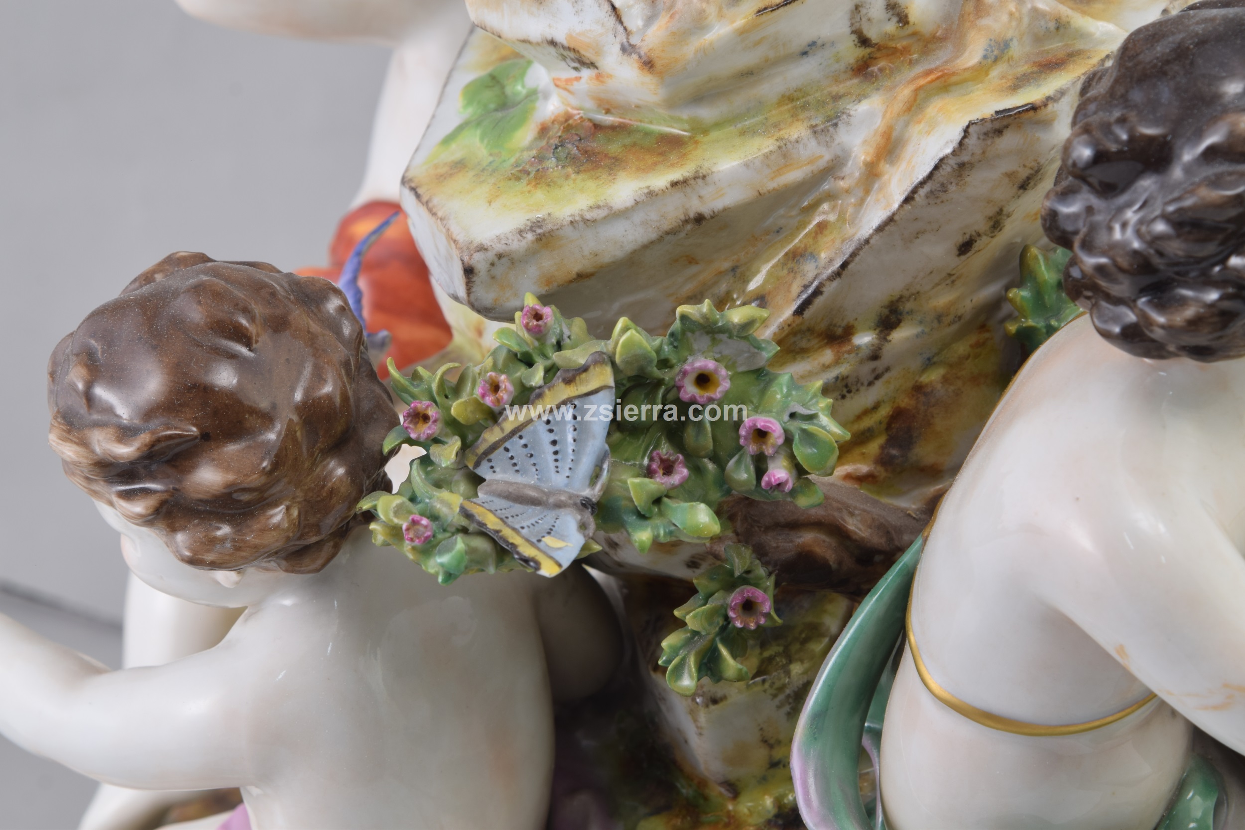 La firma de la fábrica se sitúa en la parte inferior del centro, claramente visible, y en tonos azules, con una firma (Marion) “grabada” debajo de la misma. La fábrica de Volkstedt, situada en Rudolstadt (Thuringia, Alemania), fue fundada por una petición oficial realizada en 1760 por Georg Heinrich Macheleid, quien había trabajado en la fábrica de vidrio de Glücksthal, y habría logrado la fórmula de la porcelana por medios propios, sin contactos con los ceramistas de Meissen Ehrenfried Walther von Tschirnhaus y Johann Friedrick Böttger. El privilegio fue otorgado en 1762 por Johann Friederich (príncipe de Schwarzburg-Rudolstadt), especificando que se estableciera en ese punto, cerca de su corte y bajo su dirección personal. Tras varios cambios de manos a lo largo de los años, sigue vigente en la actualidad.