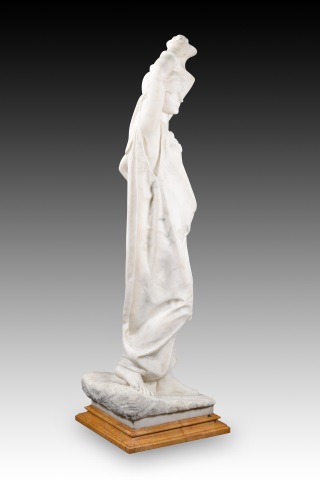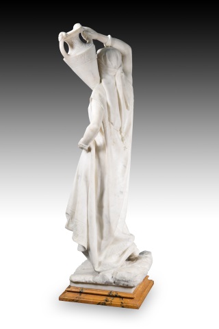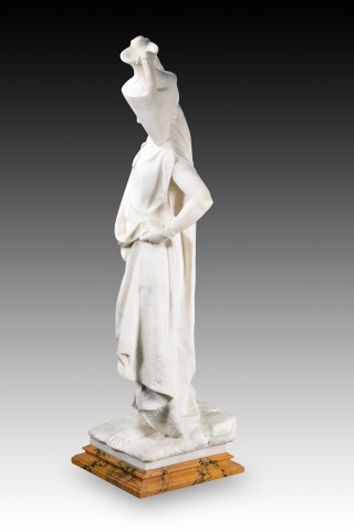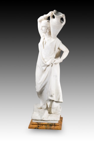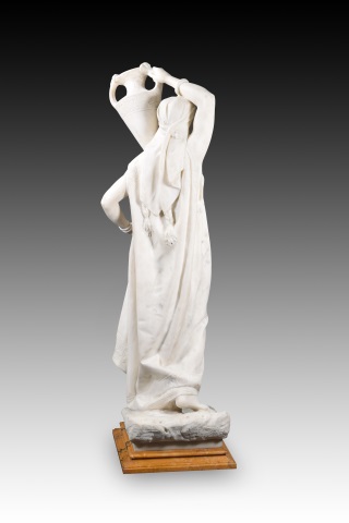 Escultura de mármol blanco situada sobre una pequeña base de mármol veteado que representa a una joven vestida con una túnica larga, que ella misma recoge hacia un lado con una mano, mientras con la otra agarra un cántaro sobre su cabeza, vasija que apoya sobre uno de sus hombros en una postura que no es la habitual. Presenta joyas y el cabello cubierto.