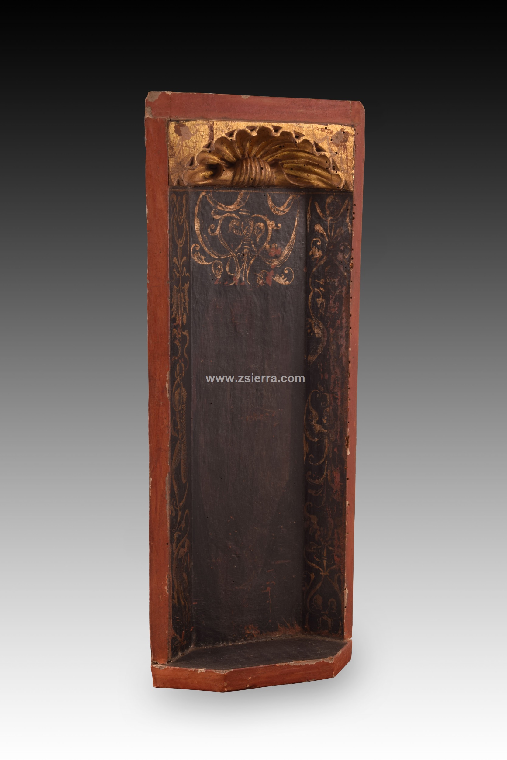 Hornacina para pared con hueco frontal rectangular rematado por una forma avenerada acabada en dorado con dos cabezas de ángeles policromados en las esquinas, y un espacio policromado en oscuro con elementos clasicistas en dorado (candelieri con grutescos, lacerías, roleos, etc.). La base presenta al frente un acabado poligonal, con el filo en tono rojo, como el resto de la pieza. Este tipo de peanas fueron muy habituales en oratorios privados tanto de entornos civiles (casas, etc.) como religiosos (conventos, capillas…) para situar y realzar esculturas de pequeño formato. Peso: 850 gramos.