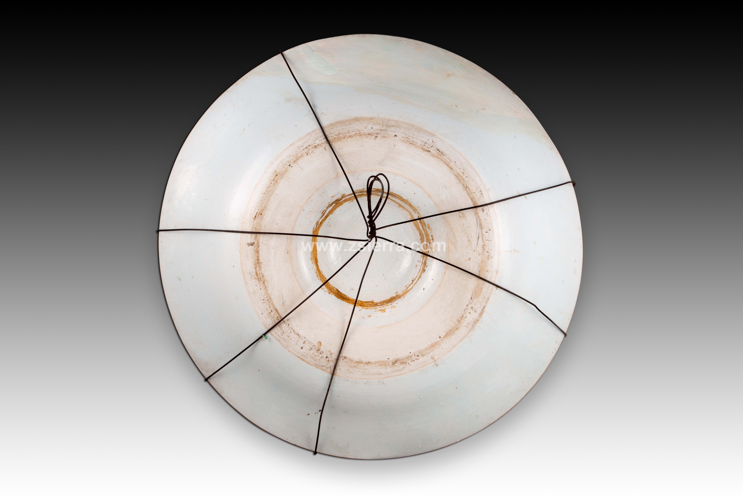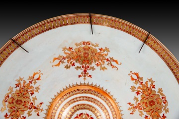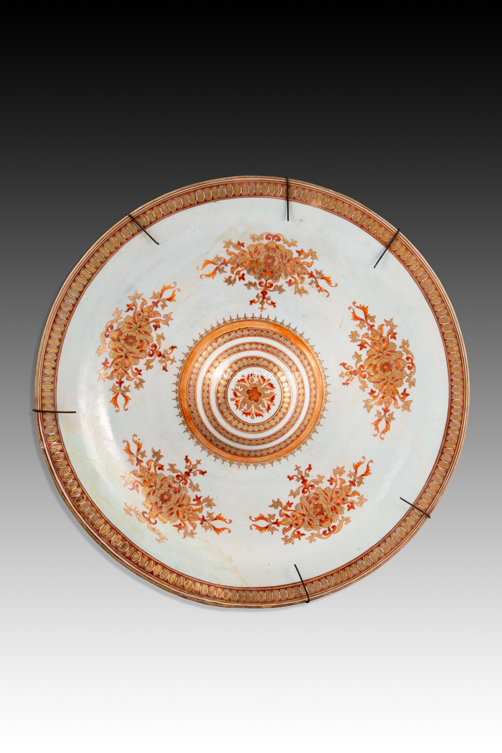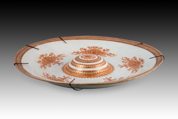 Bandeja circular con umbo central realizada en porcelana blanca con decoraciones en hierro rojo y dorado de temática vegetal y geométrica de inspiración oriental, la cual se encuentra repartida entre el borde y el umbo, con cinco composiciones vegetales simétricas entre ambos. Alguno de sus elementos decorativos son muy similares a los de la porcelana de la Compañía de Indias, traída de China. Lo más llamativo es el pronunciado umbo central, habitual en trabajos de influencia hispanomusulmana en la Península Ibérica pero no en la porcelana europea.