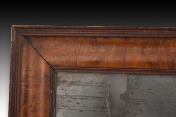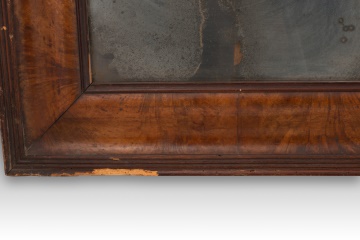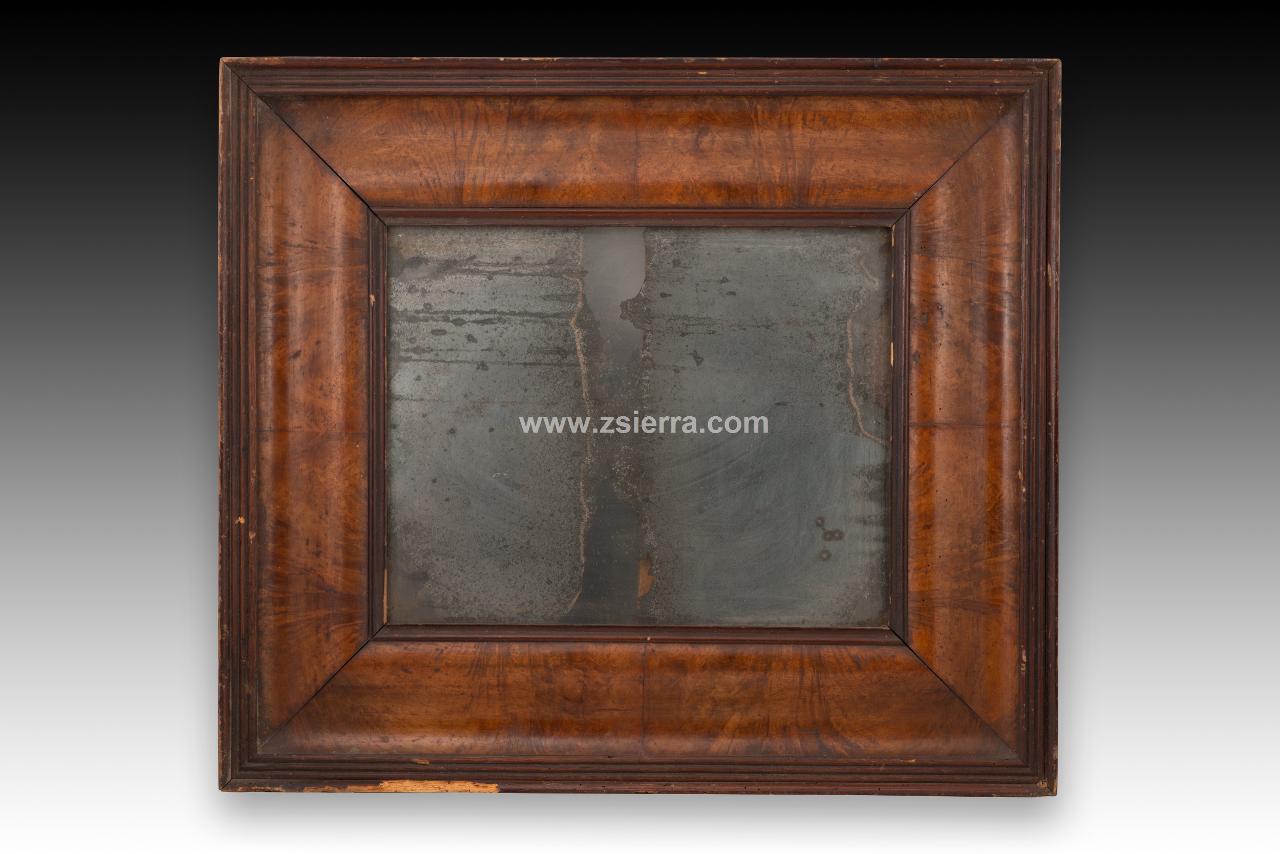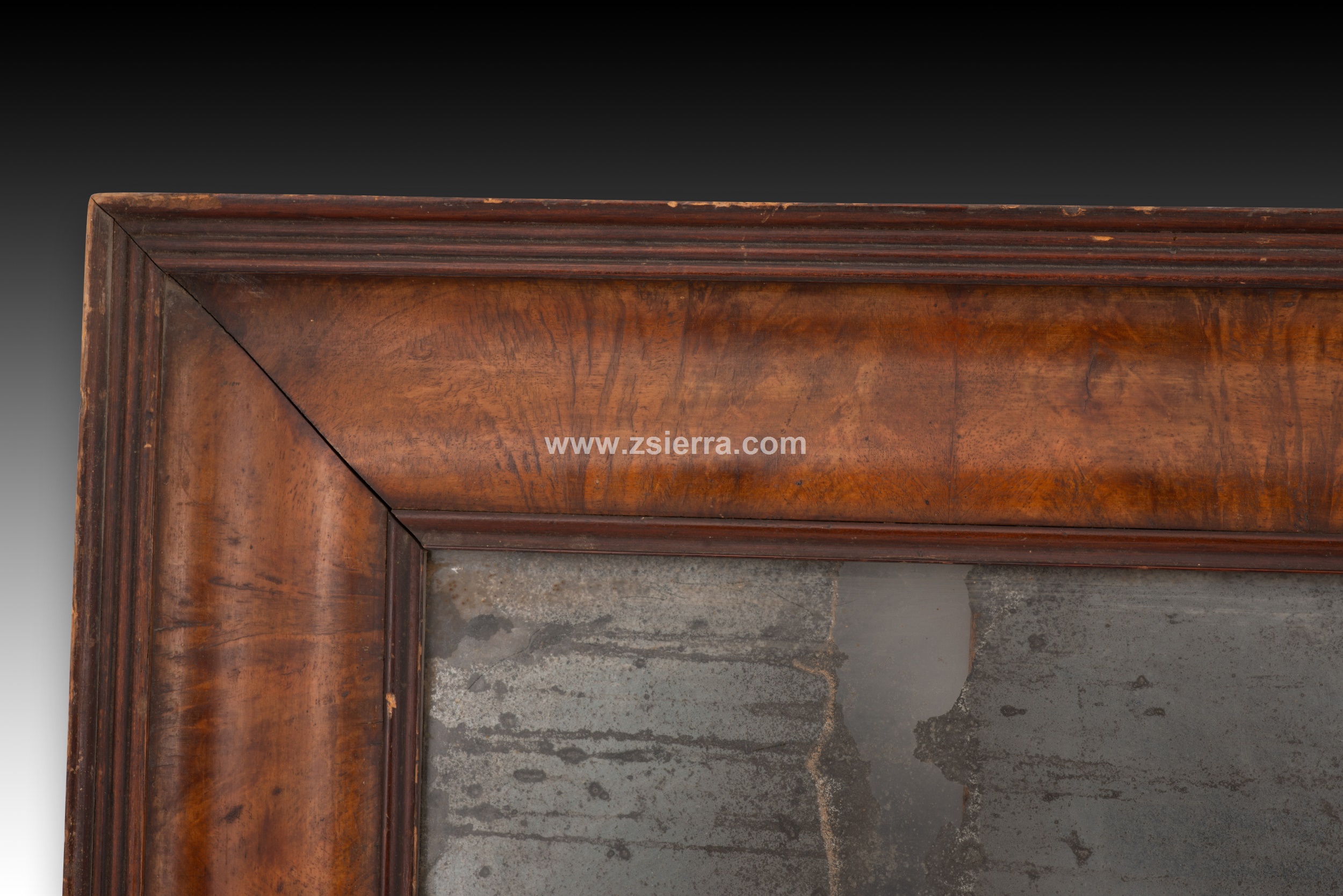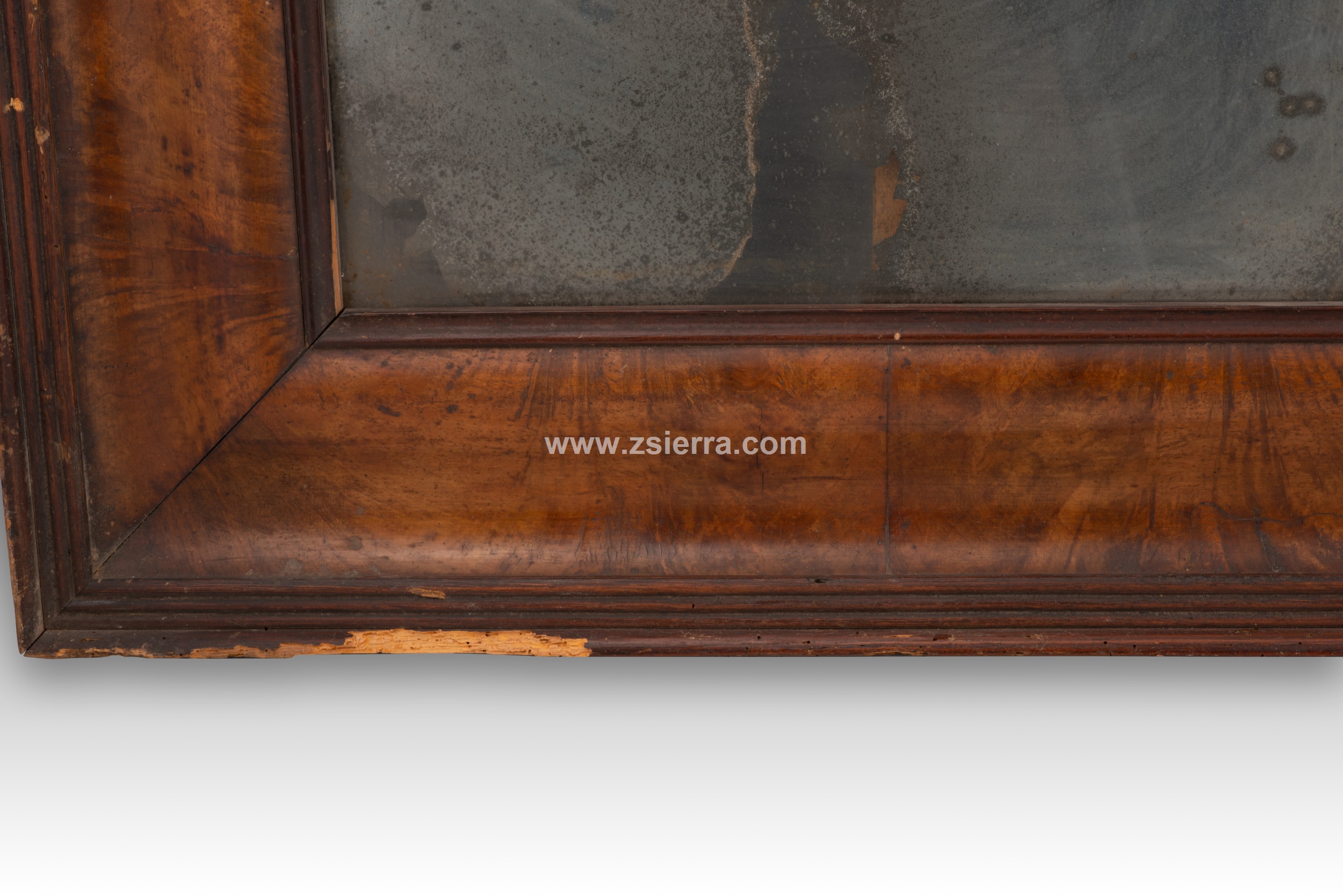 Marco de madera oscura con una banda lisa entre dos de molduras finas que recuerda a ejemplos antiguos de influencia inglesa. La lámina de espejo presenta la oxidación habitual en este tipo de trabajos cuando son antiguos, añadiendo valor al conjunto con estos cambios únicos. Falta parte de la protección posterior de madera.