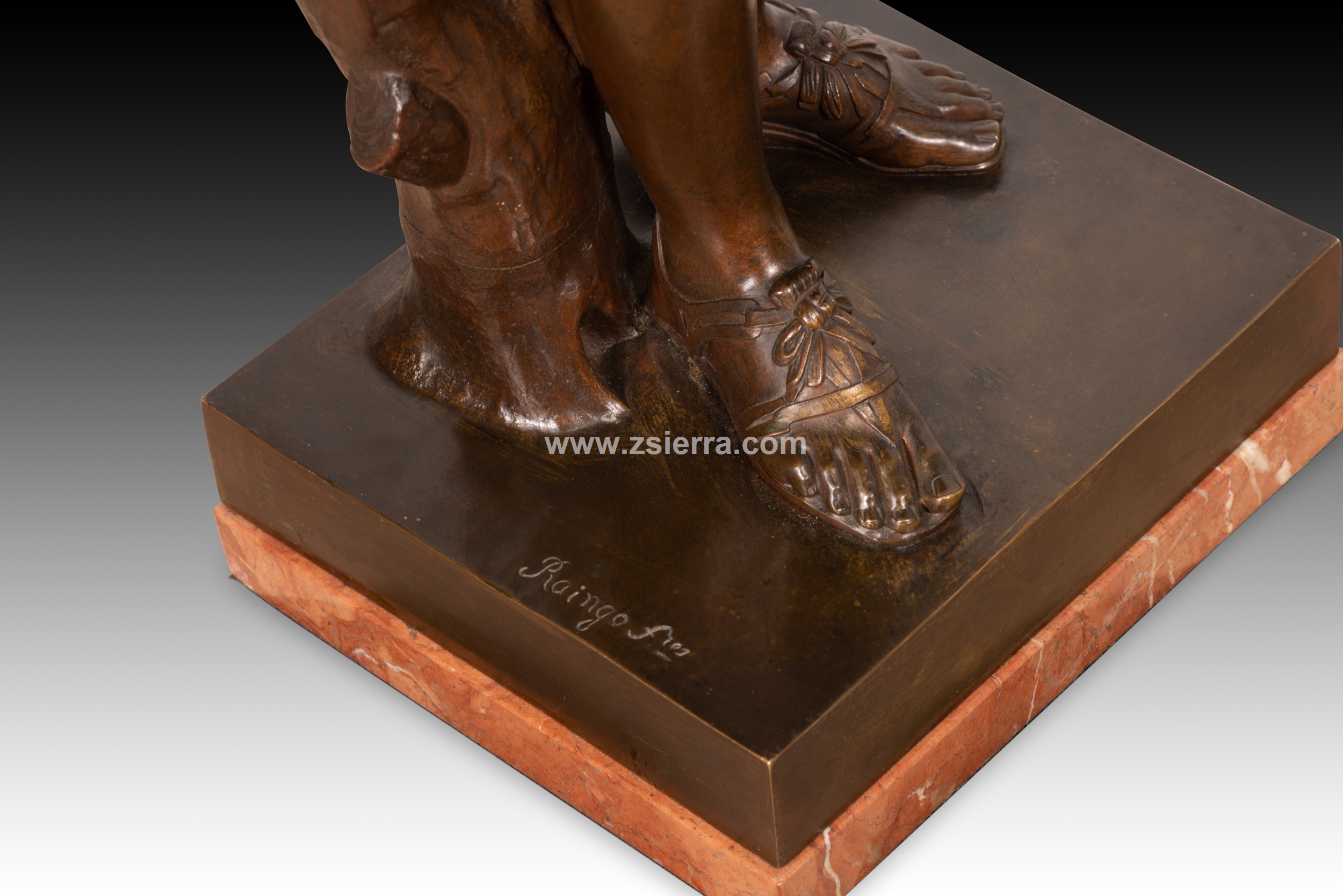 Raingo Frères fue fundada por los cuatro hijos del relojero y metalúrgico Belga Zacharie Raingo (trasladado a París en 1813) en 1823, llamados Adolphe, Charles, Denis y Dorsant. Establecida como empresa industrial y comercial, la compañía adquirió rápidamente notoriedad por su trabajo en bronce, además de su fama como fabricante de relojes. Creó obras para toda una serie de nobles y miembros de la realeza, como el duque de Chartres, el rey Jorge V de Inglaterra y el emperador Napoleón III de Francia. Mostraron su trabajo en las Exposiciones Internacionales de París de 1867, 1878 y 1889, ganando varios reconocimientos. Conservan obras de esta casa destacadas colecciones privadas e instituciones como el Museo Nacional de Artes Decorativas (Madrid, España), el Victoria and Albert Museum (Londres), la Royal Collection Trust, etc. Peso: 37 kg.