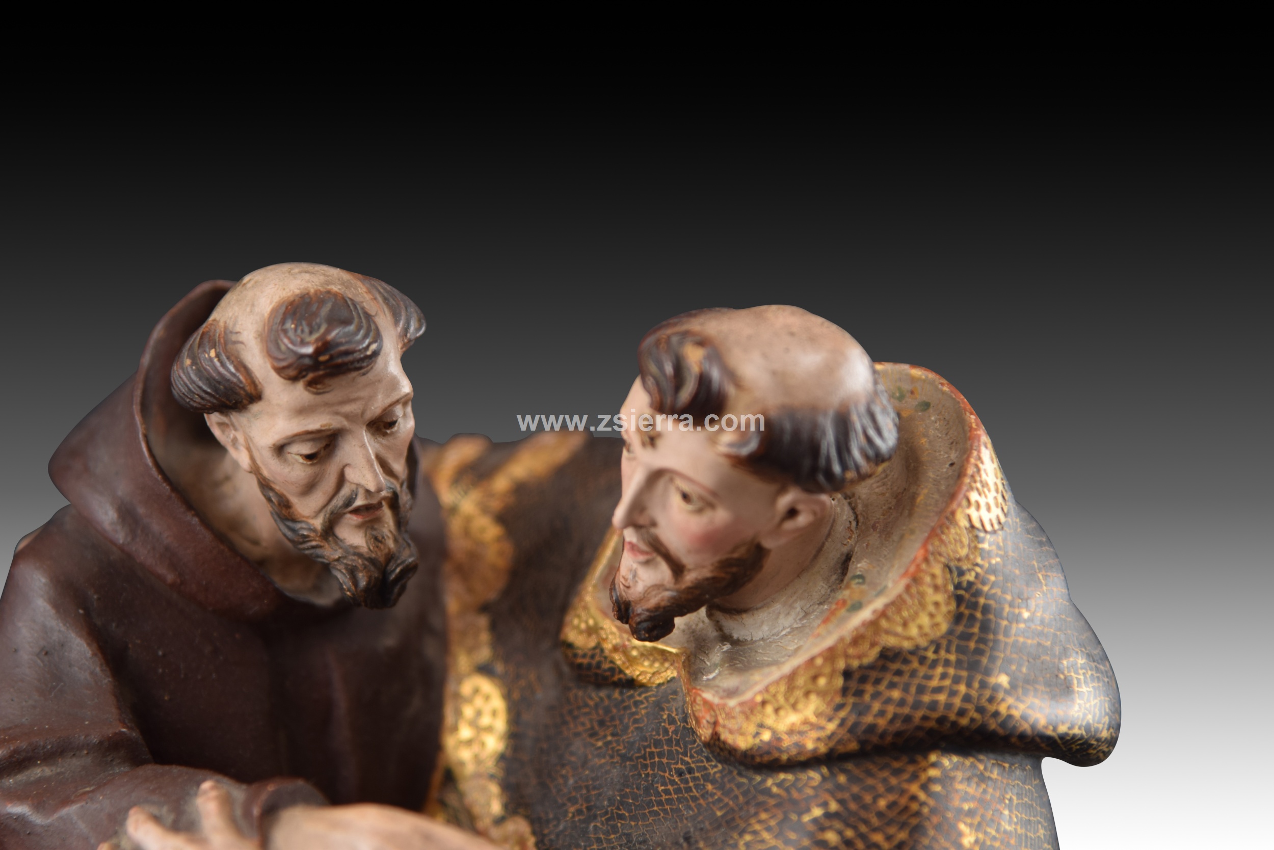 “Encuentro de Santo Domingo y San Francisco”. Escultura en terracota policromada. Escuela colonial, siglo XVII.