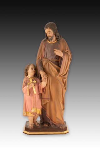 La presente pieza muestra todavía influencia del Barroco, pero ya apunta una cierta influencia neoclásica en algunos detalles, manteniendo las particularidades propias de su escuela. Compárese, por ejemplo, con el “Abrazo” del Monasterio de Santo Tomás de Ávila de Luis Salvador Carmona, fechado en el siglo XVIII. Asimismo, es preciso destacar la calidad del modelado y de la policromía de la pieza, con un estado de conservación notable para la antigüedad y delicadeza del material de la figura.