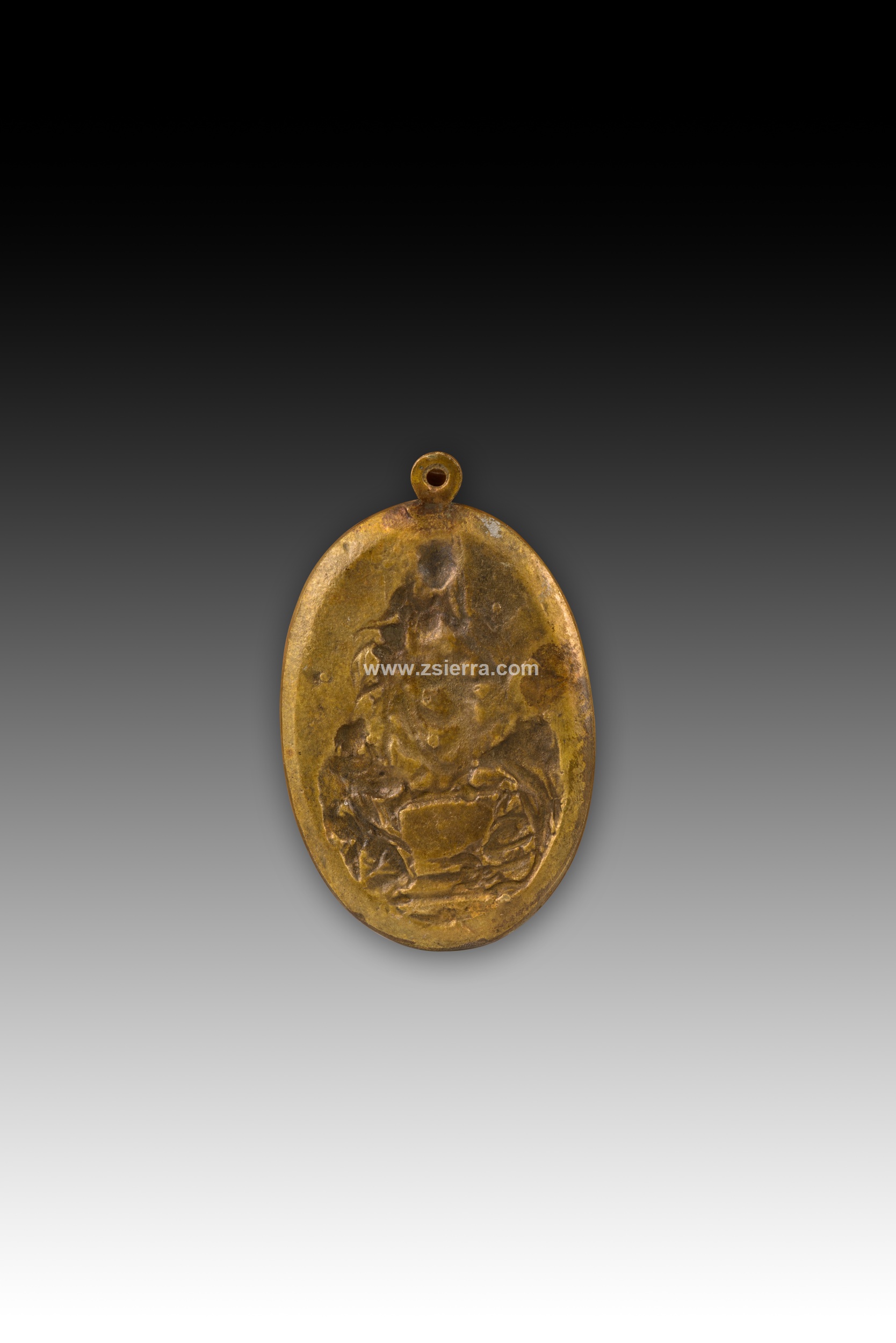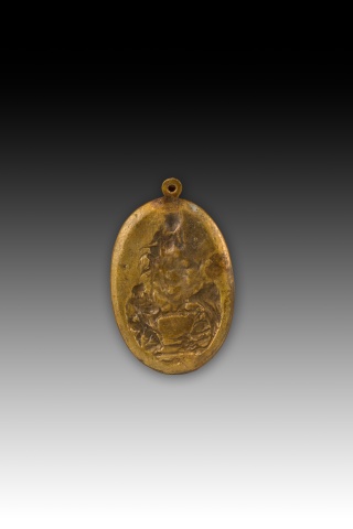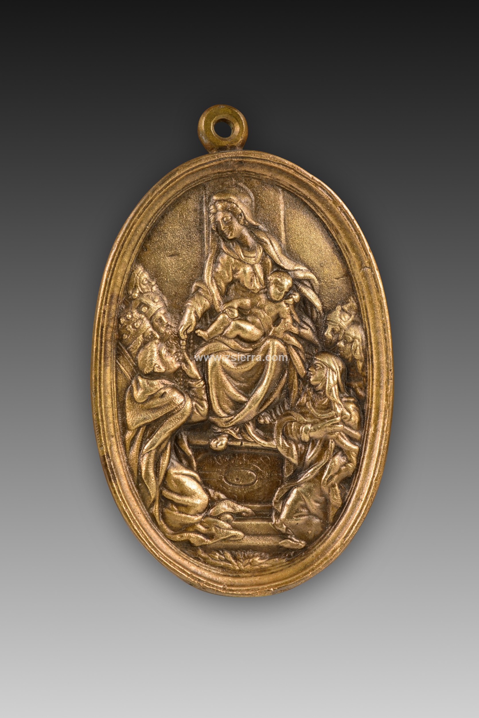 Placa devocional ovalada que cuenta con un listel moldurado y un asa en la parte superior decorada con un relieve representando a Ntra. Sra del Rosario, sedente con el Niño en su regazo, entregando el Rosario a Santo Domingo de Guzmán arrodillado a sus pies, junto a Santa Catalina de Siena. Se conserva una similar en el Museo Lázaro Galdiano de Madrid (número de inventario 5192) fechada entre 1576 y 1600 aproximadamente.