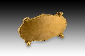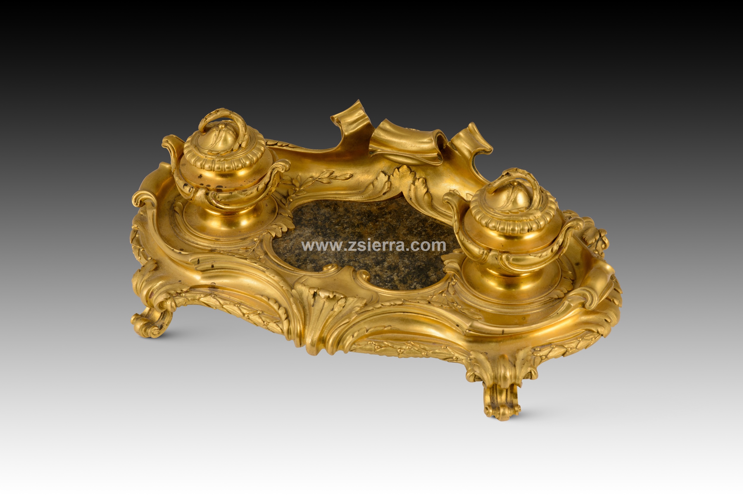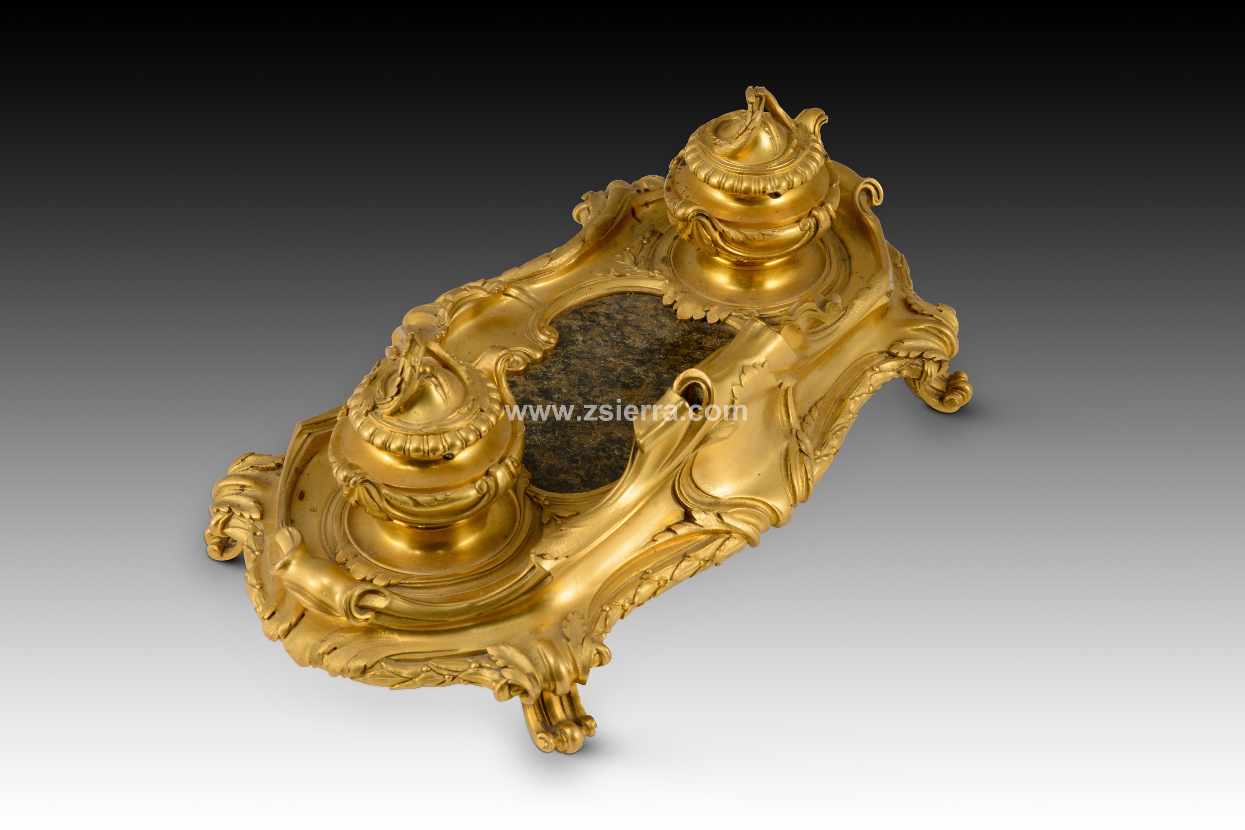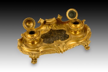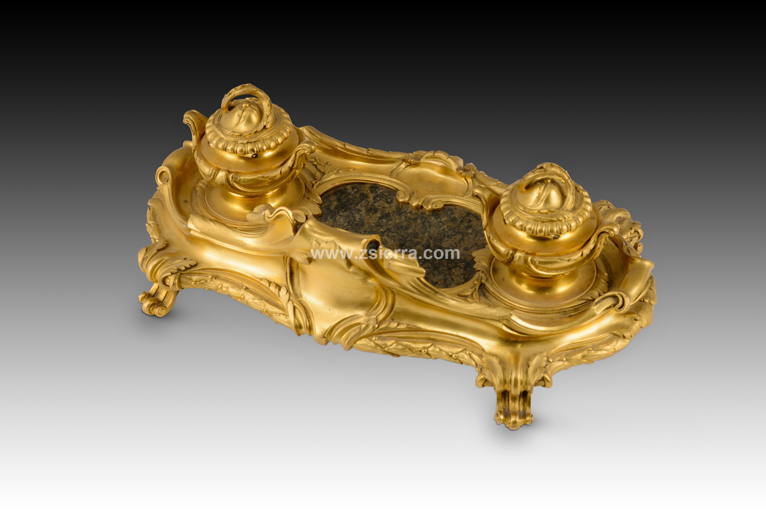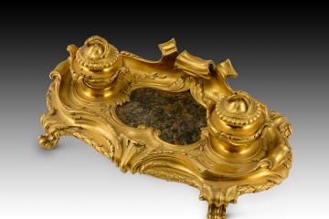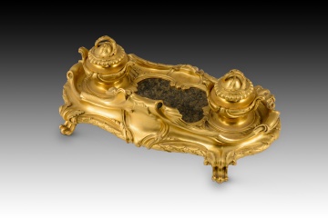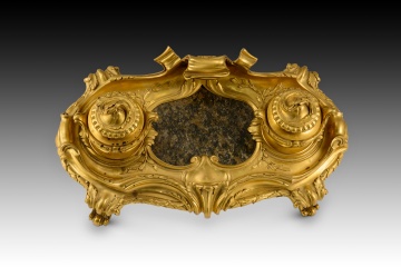 Escribanía de estilo Luis XV. Bronce dorado, piedra. Posiblemente escuela francesa, siglo XIX.