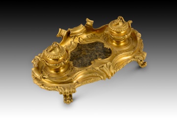 Escribanía de bronce sobredorado que cuenta con una chapa de metal en la parte inferior y, en la superior, una decoración a base de elementos vegetales, arquitectónicos, etc. de cierta influencia clasicista pero con una composición y una combinación de movimiento que recuerda algo al rococó. Alzada sobre patas con forma de volutas, cuenta con dos tinteros con tapa con bisagras y una zona central que deja ver una losa de piedra (posiblemente mármol) veteado con cierta forma de corazón, rodeada por elementos vegetales y arquitectónicos.