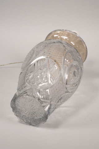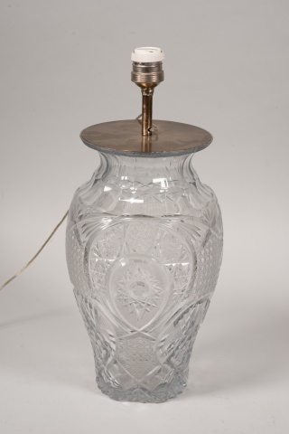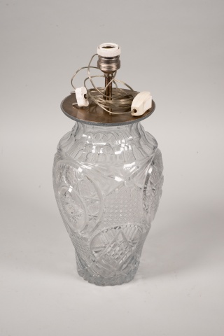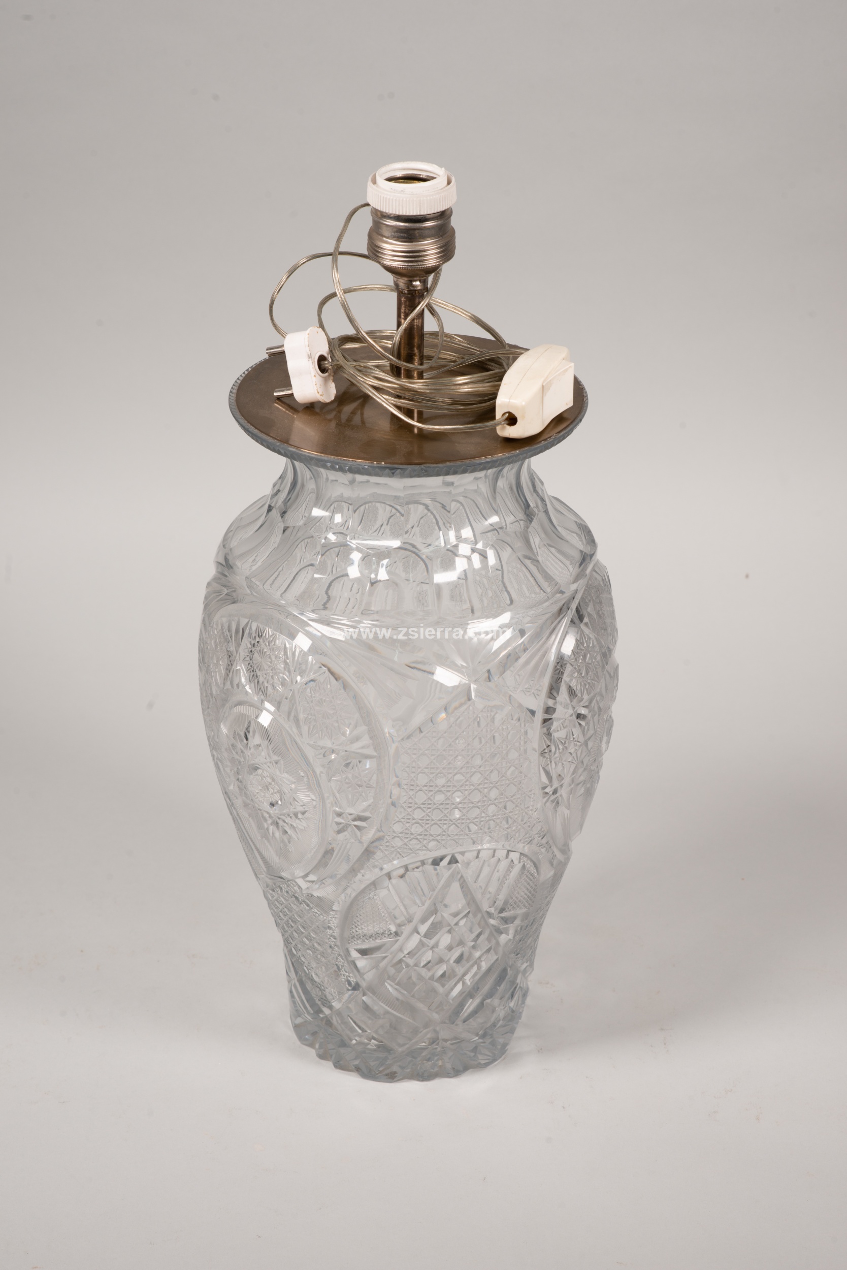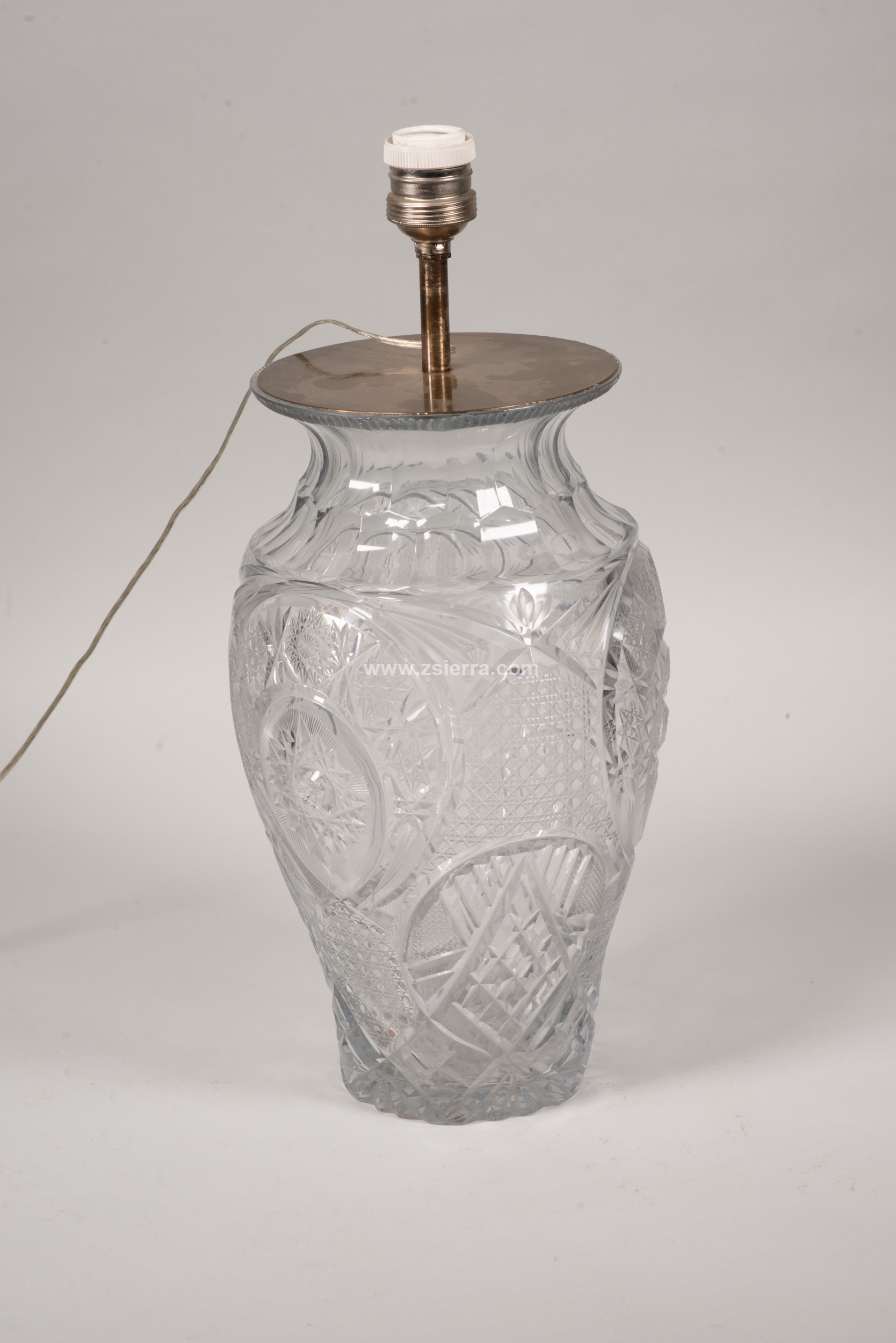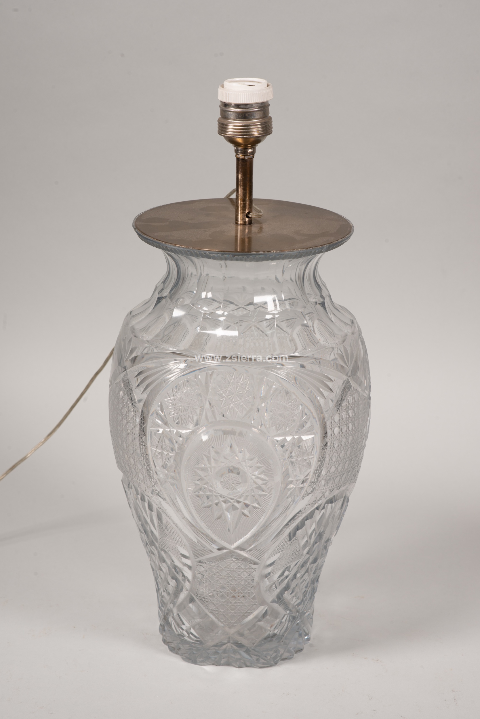 Jarrón realizado en vidrio transparente decorado con numerosos elementos geométricos tallados en relieve hacia el exterior que se ha transformado en lámpara de sobremesa añadiéndole los elementos necesarios en la parte superior. La calidad del trabajo recuerda a obras de Bohemia y otras fábricas de vidrio destacadas.