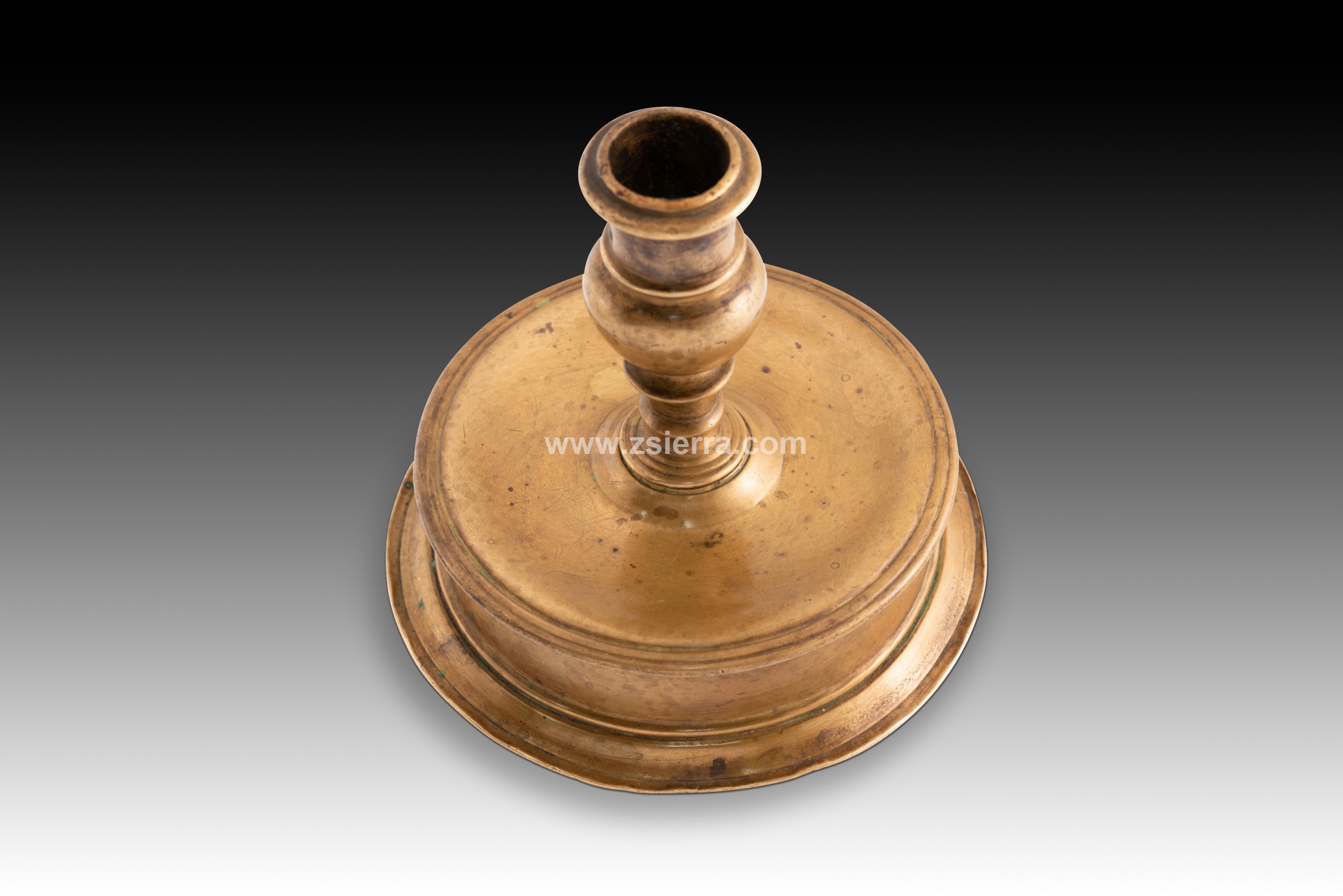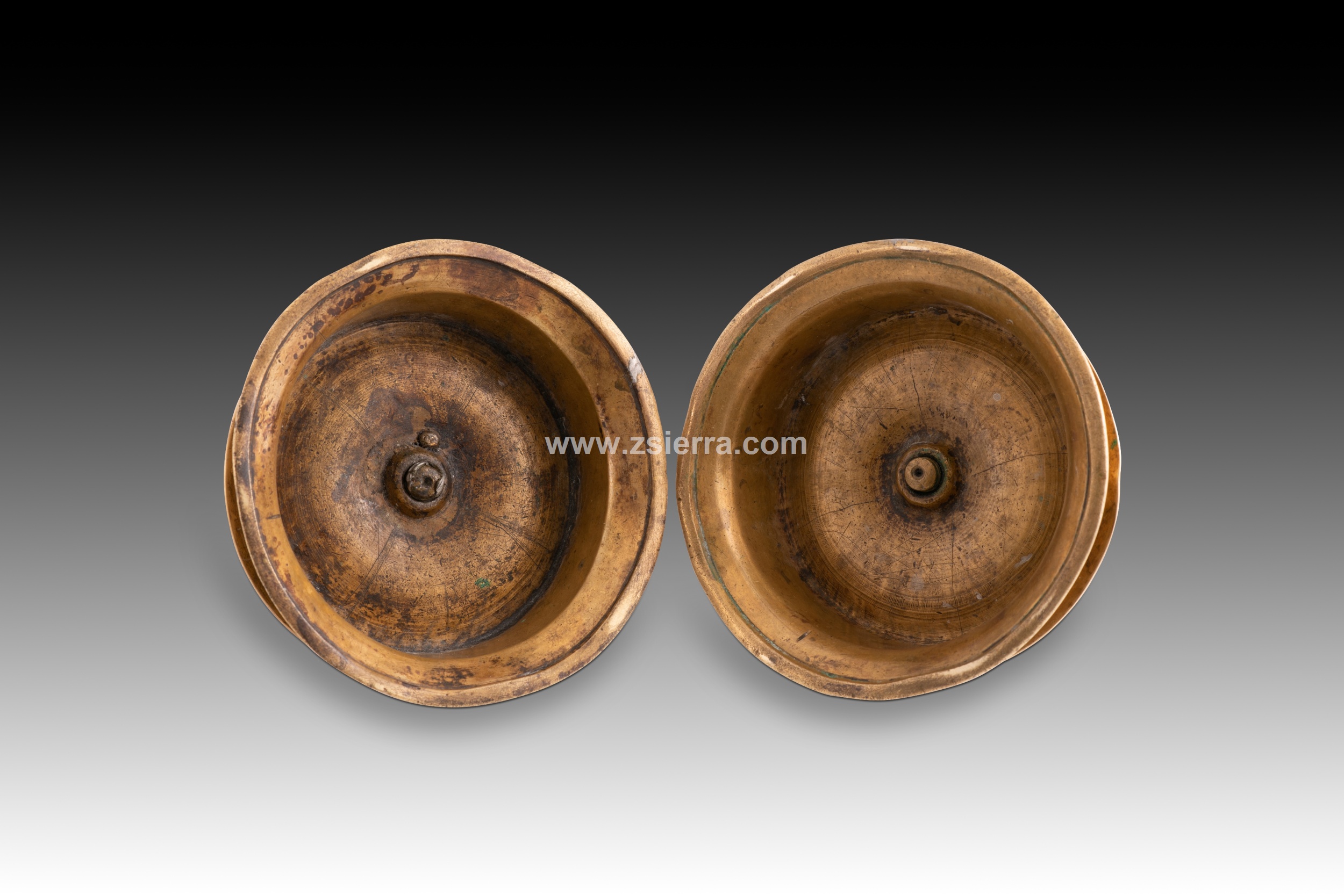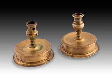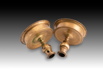 Pareja de candeleros de bronce con base circular y elevada realzada mediante molduras lisas salientes, con eje decorado por discos y parte superior con forma abultada. Pertenecen al tipo conocido como “de carrete”, y fueron habituales en ciertas escuelas europeas, por ejemplo, se puede encontrar ya en piezas españolas góticas, siendo muy común desde entonces. A lo largo de los siguientes siglos se variarían detalles como la proporción de la base, las líneas de la misma y el remate superior, adaptándolo al gusto de cada momento.