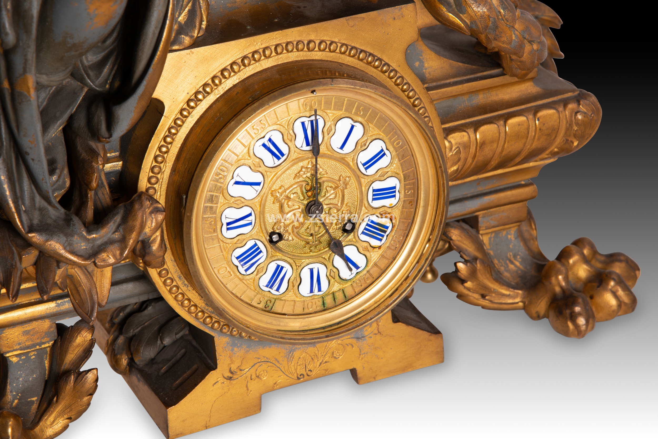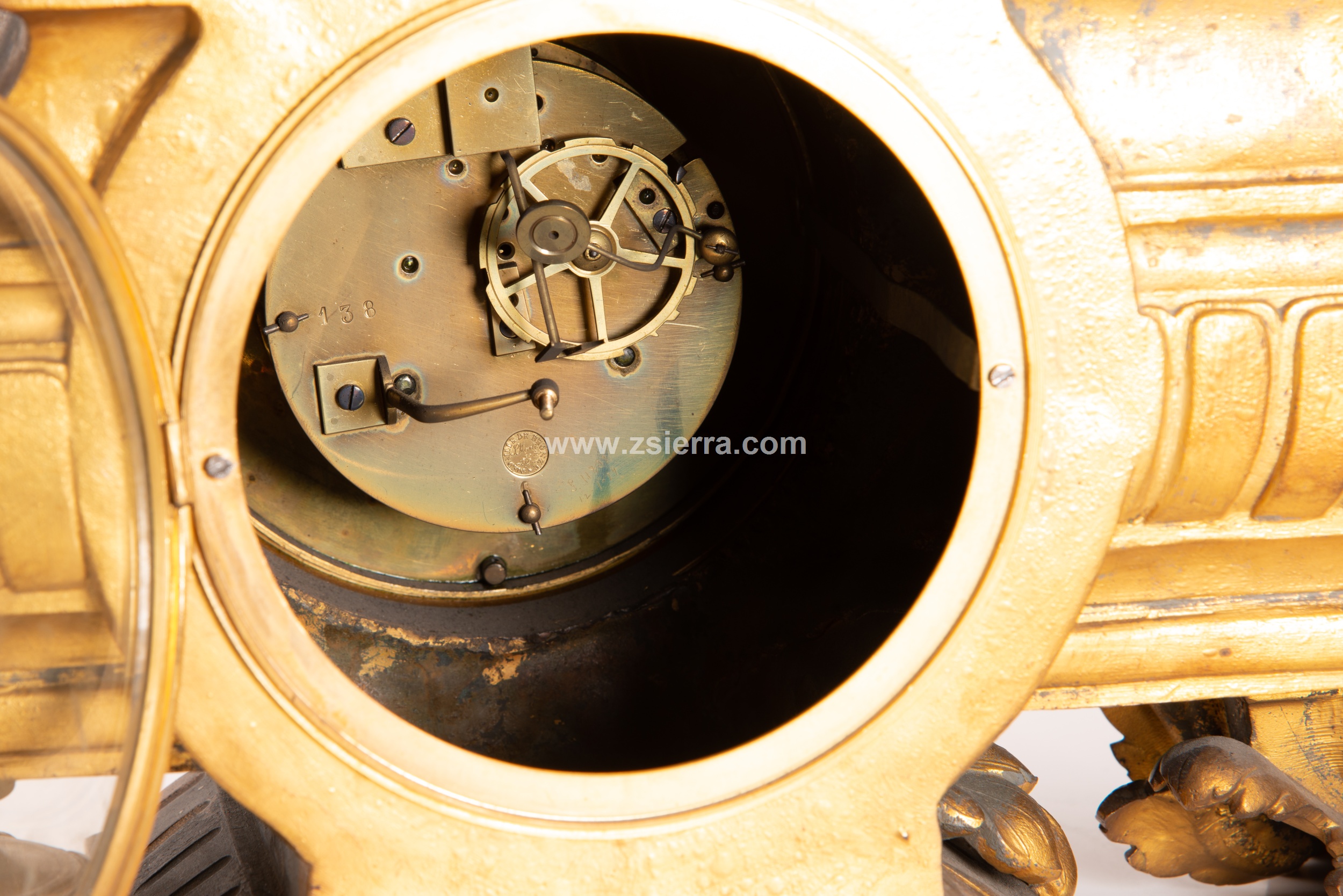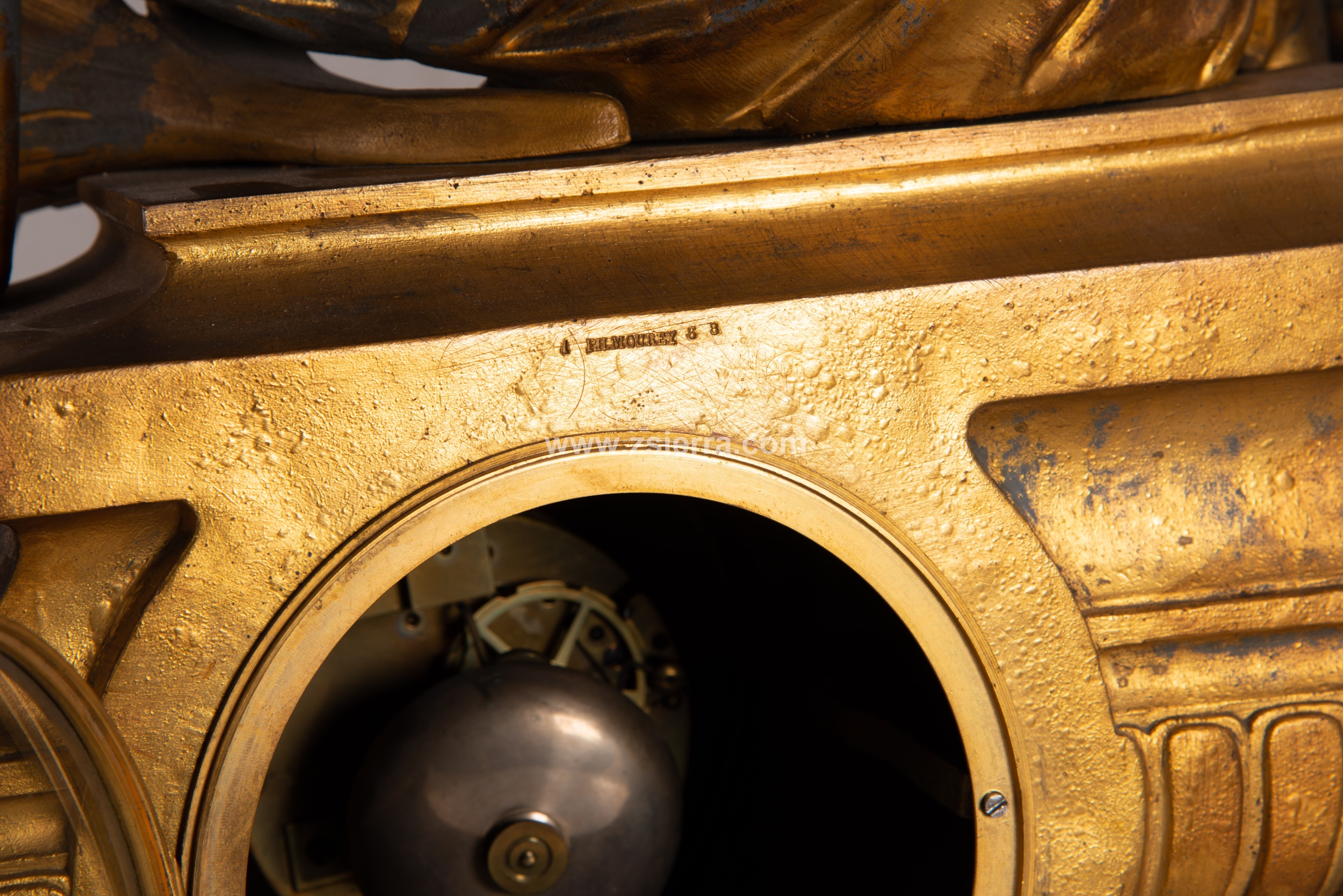 El movimiento de tipo París presenta un sello alusivo a la medalla de bronce de Samuel Marti et Cie., recibida en la Exposición de París (Francia) de 1855 o en una de 1860 y que la empresa relojera mantuvo hasta 1889 (otros expertos fechan esta marca entre 1867 y 1900). En el dorso, en la zona de la base, aparece grabada la inscripción “PH. Mourey 6 8”, alusiva a Philippe Mourey (activo 1840-1910/20), broncista y relojero francés. Peso: 25 kg.