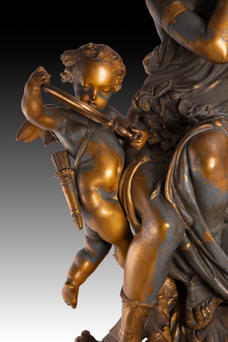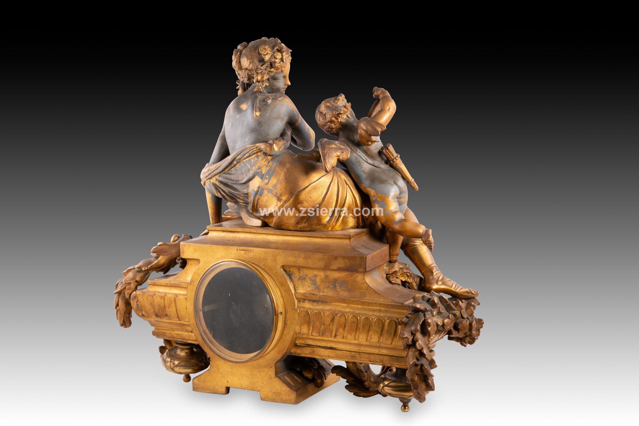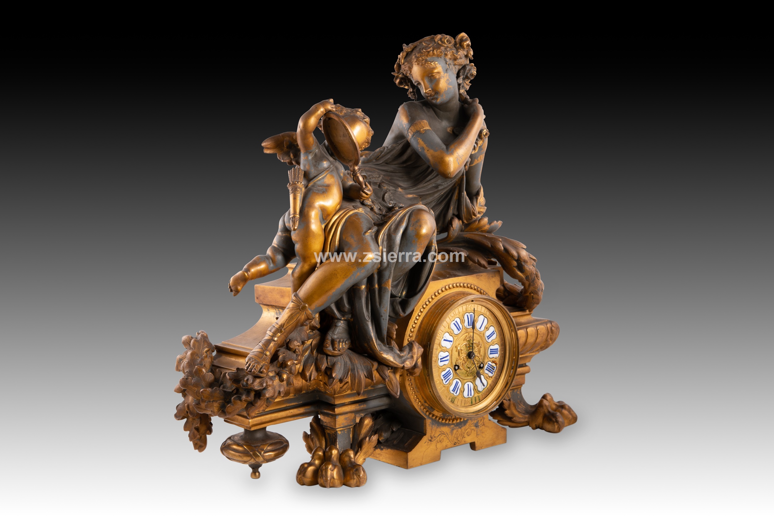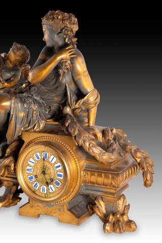 Reloj de mesa con esfera con numerales en azul sobre fondo blanco y en romanos para las horas y grabados sobre el metal y en arábigos cada cinco unidades para los minutos, que cuenta con una base con garras de animal y motivos vegetales y discos. Sobre esta se encuentra recostada una figura femenina vestida con una túnica y acompañada por un niño con alas y carcaj con flechas a la espalda, pudiendo tratarse de Venus y Cupido.
