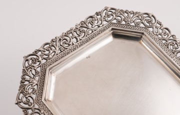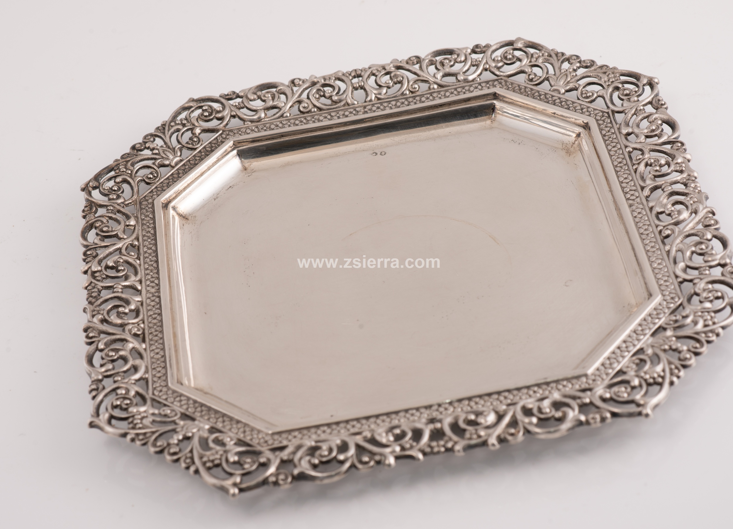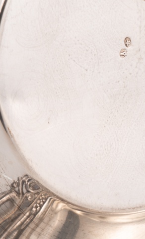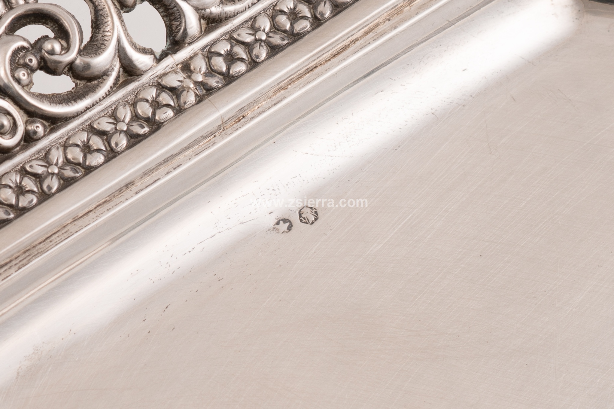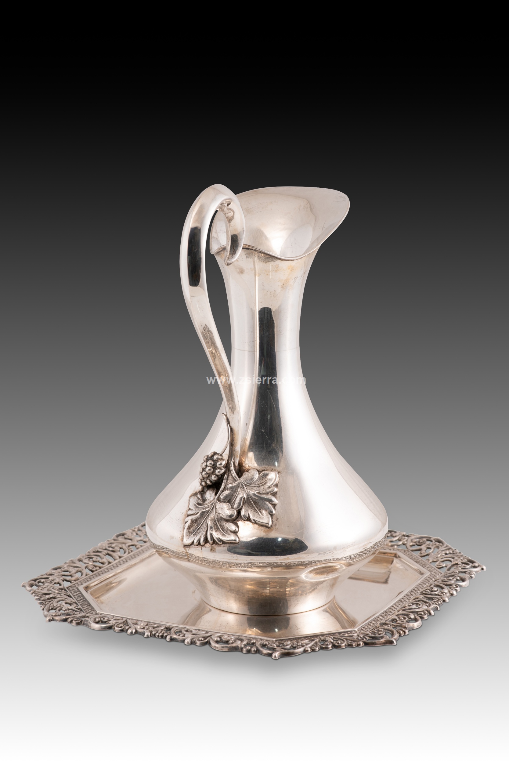 Jarra y bandeja realizadas en plata en su color la primera con una decoración de parras y uvas en el asa y la segunda con un borde siguiendo modas habituales en platería española antigua. Las marcas de contraste la sitúan como obra española del siglo XX, de Montejo orfebres y de otro platero sin identificar. Peso: 827 gramos.