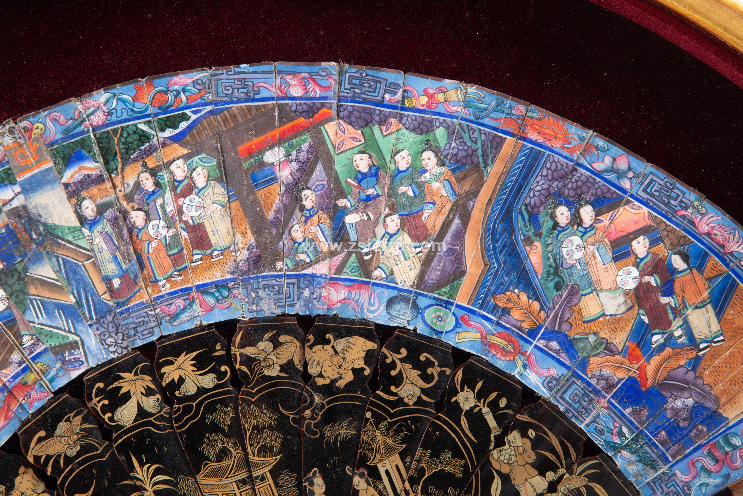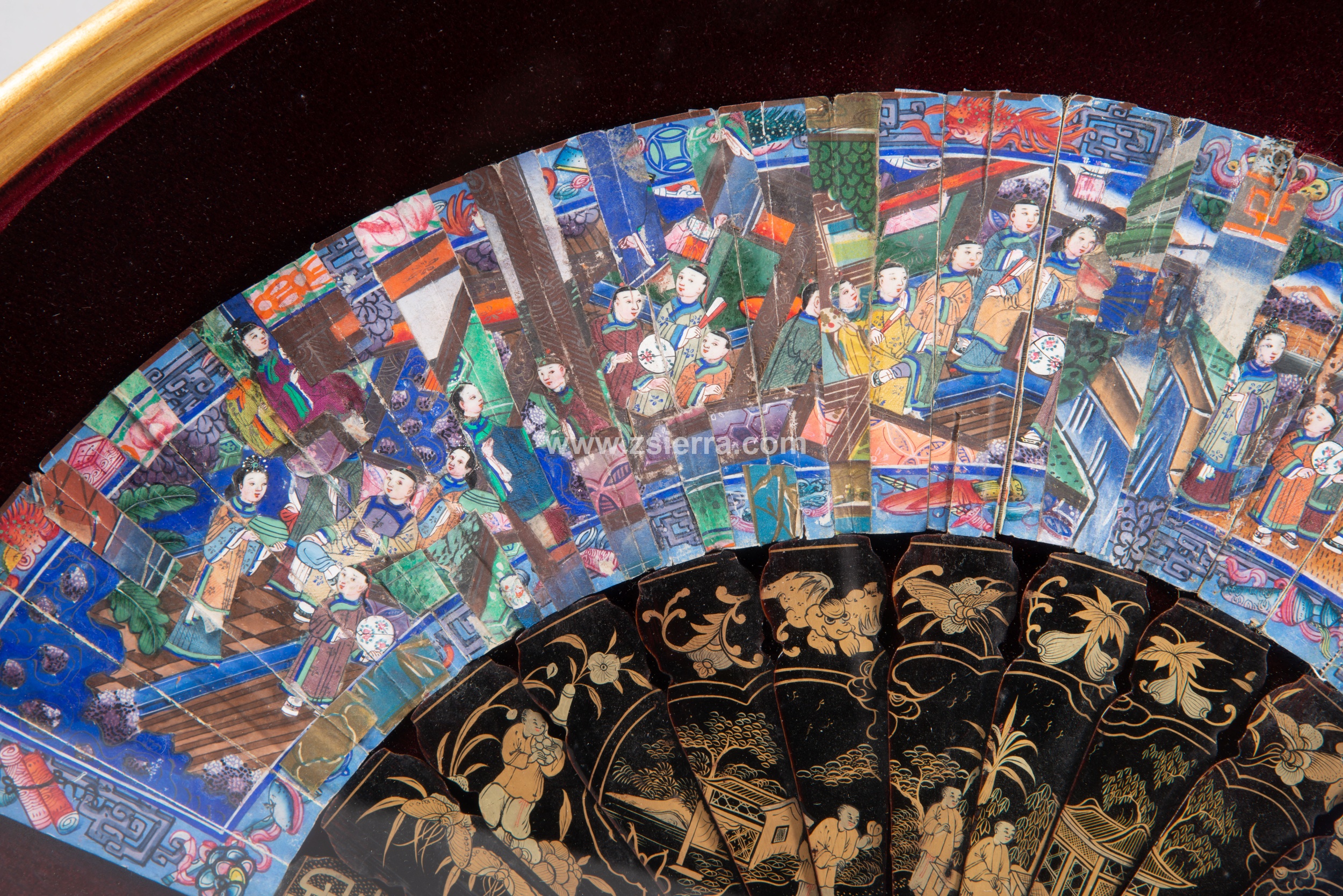 Abaniquera posterior que contiene un abanico con país de papel decorado con una pintura en que se presenta un escenario cortesano con personajes orientales ricamente ataviados enmarcado por un borde con elementos arquitectónicos y otros objetos. El varillaje, de madera lacada con elementos en dorado, presenta motivos vegetales y, de nuevo, otro paisaje cortesano de jardín con pabellones y personajes. Este tipo de abanicos fueron realizados en China para su exportación a Europa, siendo muy populares durante el siglo XIX.