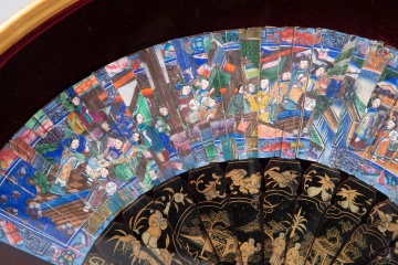 Abanico “mil caras” en abaniquera. Papel, madera lacada, madera vidrio… Cantón, China, finales de la dinastía Qing (1644-1912).
