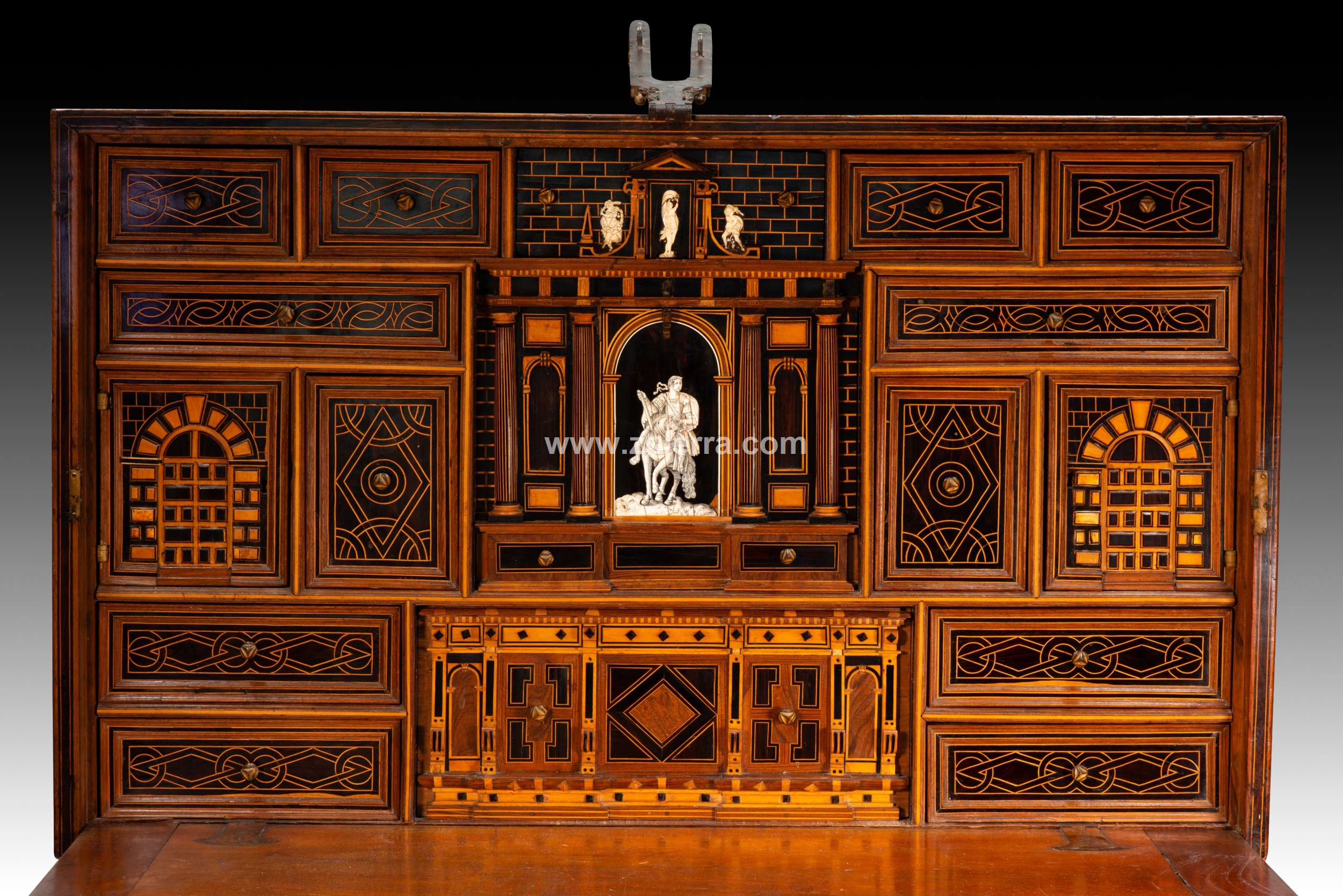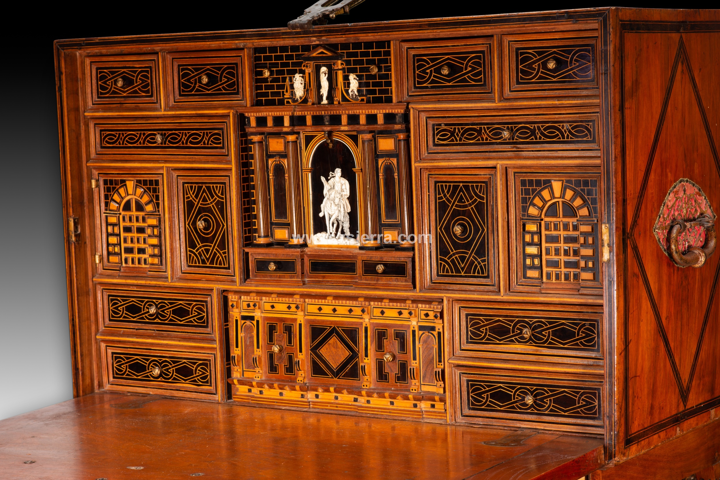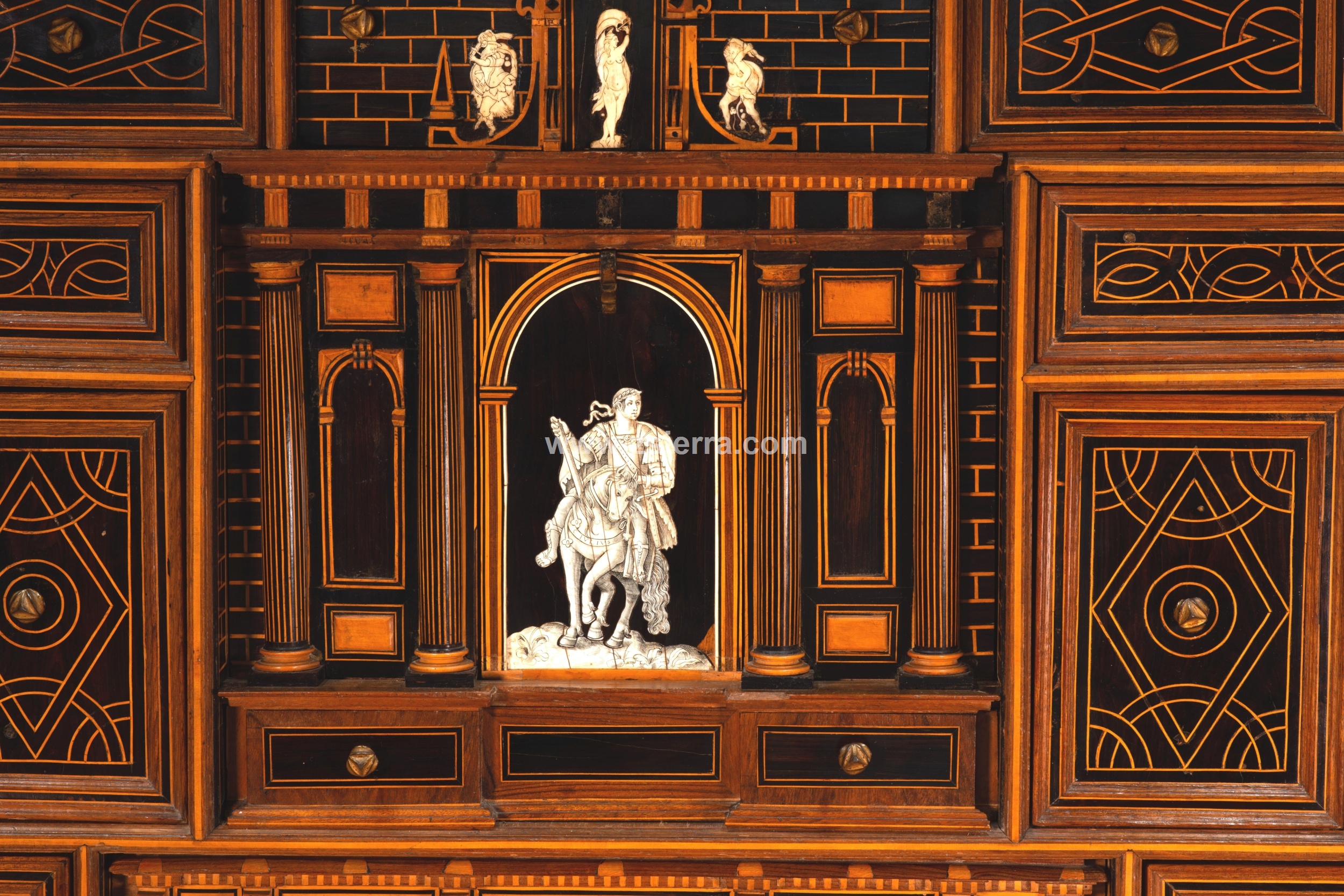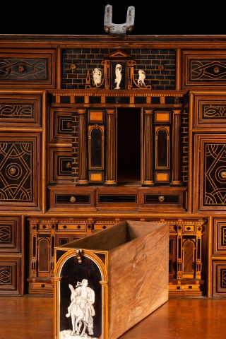 Esa composición de Arco de Triunfo del nivel medio que se prolonga en el superior muestra, en el arco central de la parte inferior, un personaje masculino montando a caballo, vestido a la manera clásica y con una corona de laureles, como si fuera un Emperador romano. Compárese este jinete con un grabado (un ejemplar en el British Museum de Londres, inventario 1957,0413.166) de la serie “Imperatorum XII” que representa a Julio Cesar (en las riendas del caballo de la figura de la papelera aparece la inscripción “C. IVULIVS C.”) y fue realizado por Adriaen Collaert siguiendo a Jan van der Straet, publicado por Philips Galle en Amberes, fechado entre hacia 1587-1587. La parte superior cuenta con una figura femenina desnuda, flanqueada por un guerrero y un “salvaje” con barba (iconografía está muy común desde el Renacimiento en España). La parte inferior tiene un cajón, la central otro (justo donde el jinete) y los laterales se mueven ocultando más cajones, otro cajón en la superior.