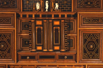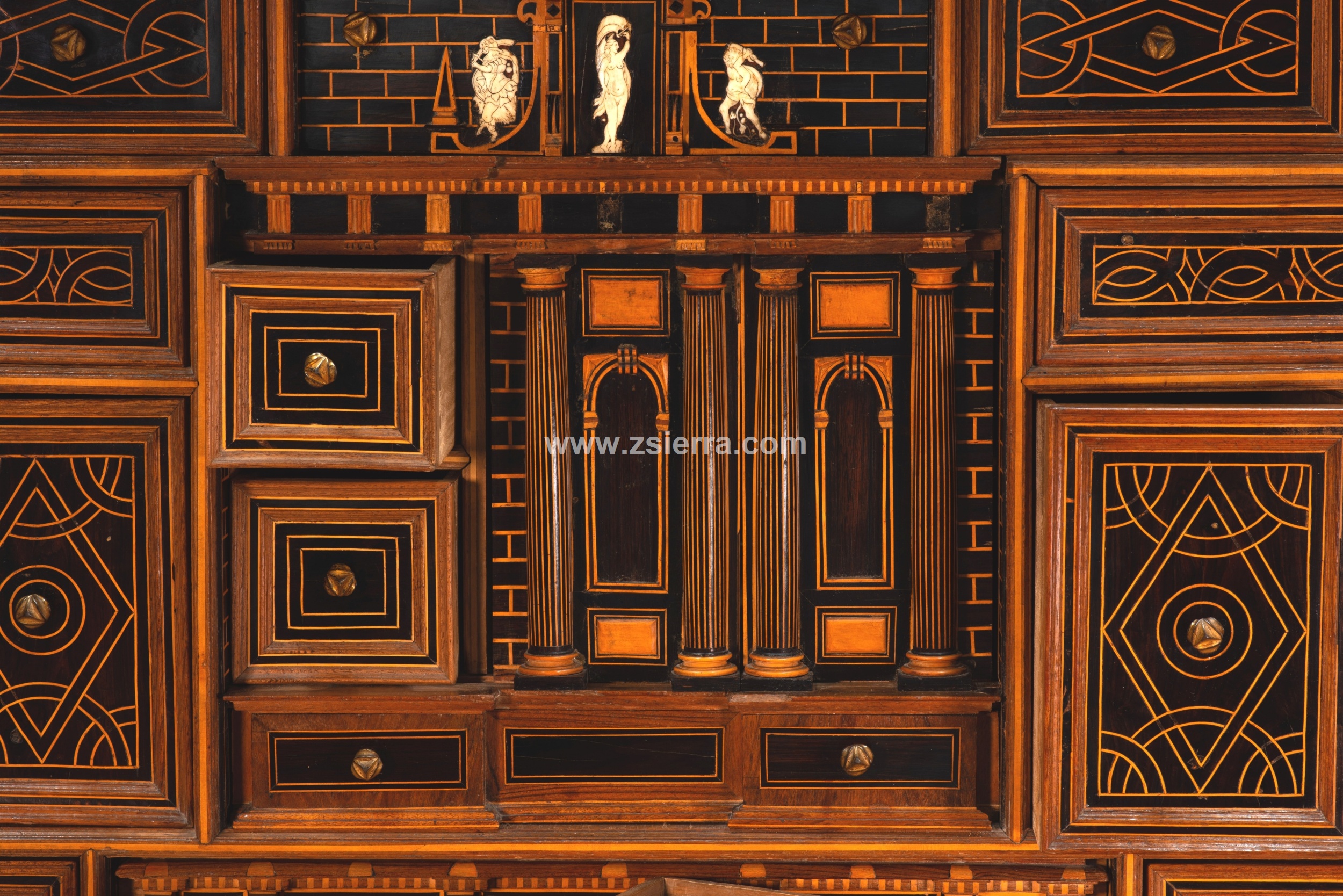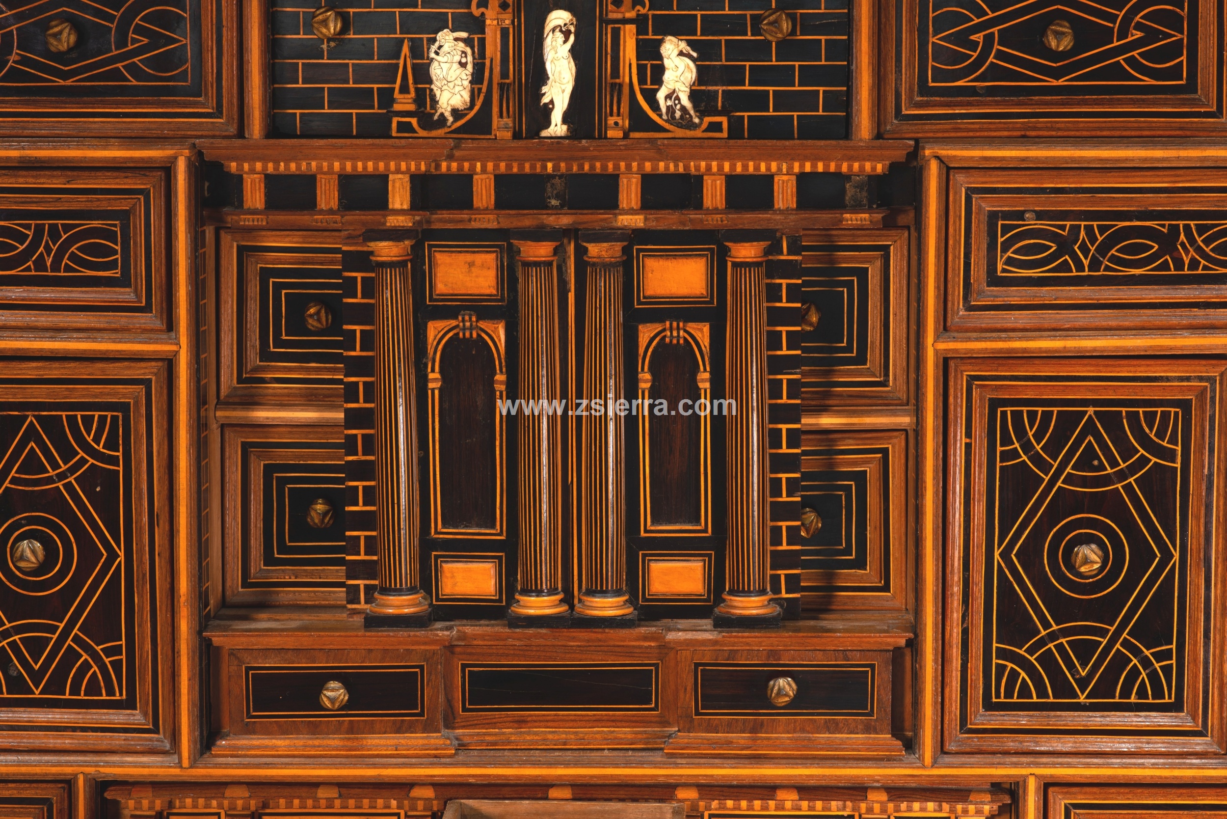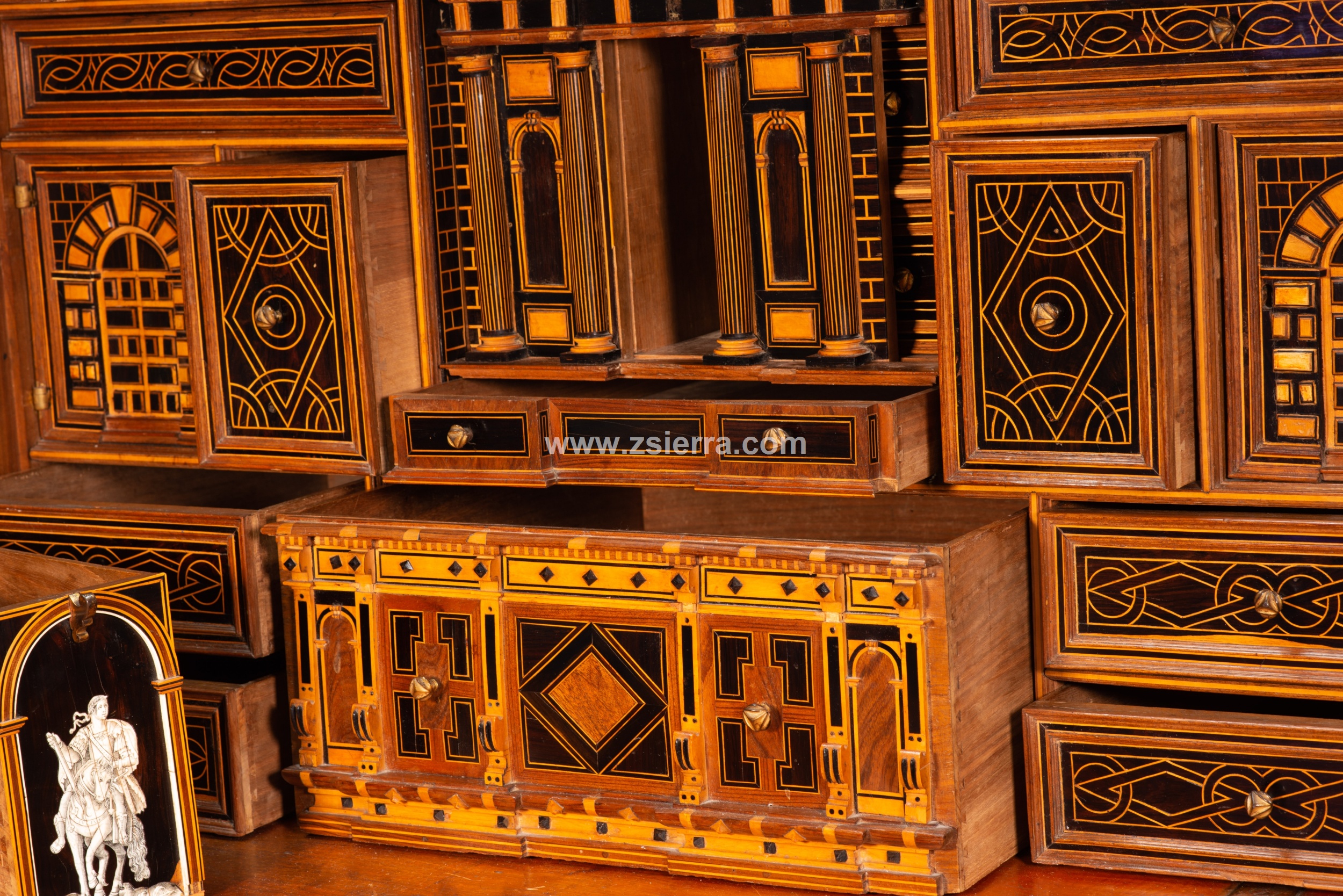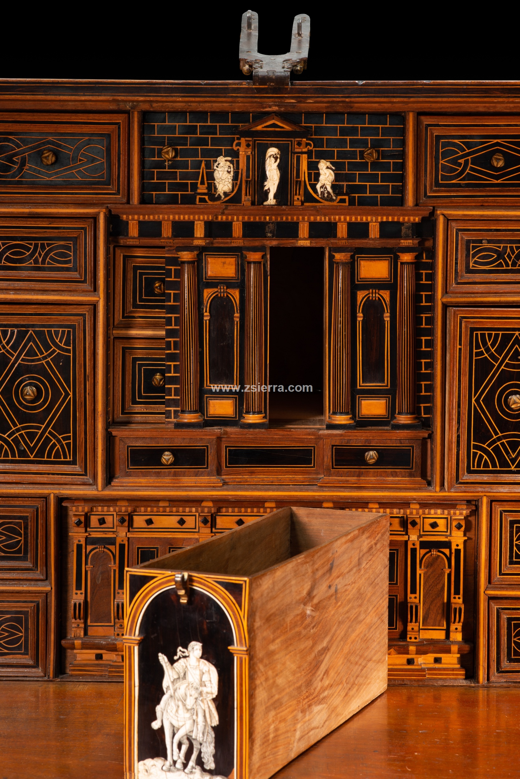 Esa composición de Arco de Triunfo del nivel medio que se prolonga en el superior muestra, en el arco central de la parte inferior, un personaje masculino montando a caballo, vestido a la manera clásica y con una corona de laureles, como si fuera un Emperador romano. Compárese este jinete con un grabado (un ejemplar en el British Museum de Londres, inventario 1957,0413.166) de la serie “Imperatorum XII” que representa a Julio Cesar (en las riendas del caballo de la figura de la papelera aparece la inscripción “C. IVULIVS C.”) y fue realizado por Adriaen Collaert siguiendo a Jan van der Straet, publicado por Philips Galle en Amberes, fechado entre hacia 1587-1587. La parte superior cuenta con una figura femenina desnuda, flanqueada por un guerrero y un “salvaje” con barba (iconografía está muy común desde el Renacimiento en España). La parte inferior tiene un cajón, la central otro (justo donde el jinete) y los laterales se mueven ocultando más cajones, otro cajón en la superior.