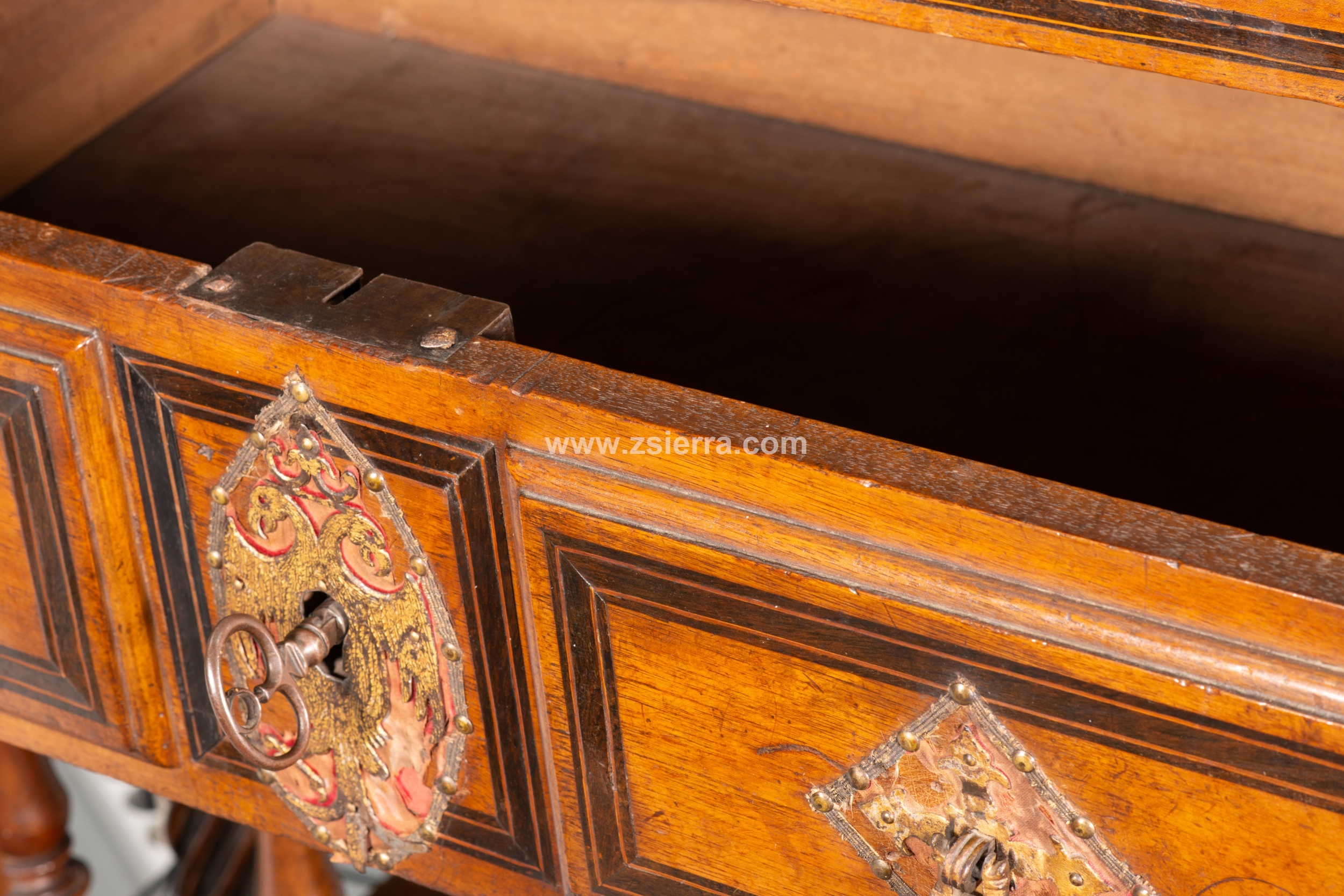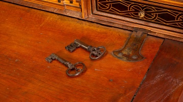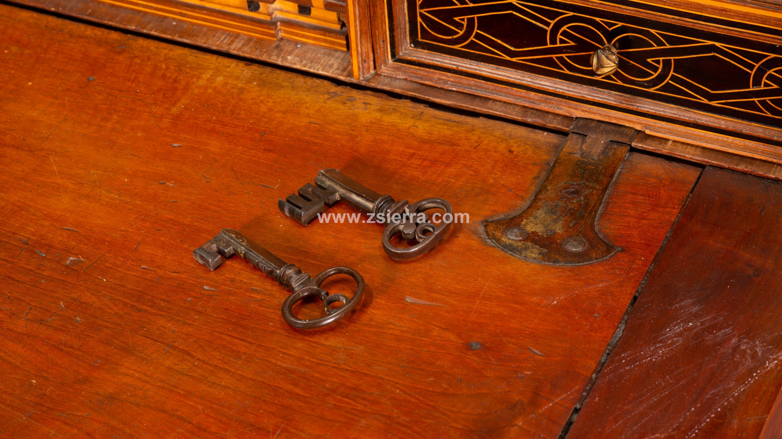 Figura masculina vestida a la manera antigua y dentro de un marco arquitectónico presenta también un escritorio o papelera fechado hacia mediados del siglo XVII que se conserva en el Museo Nacional de Artes Decorativas de Madrid de España (inventario CE01738), aunque este es de muestra abierta. La distribución de calles y niveles recuerda, por ejemplo, a otro de Salamanca, del tipo más habitual de columnillas, fechado en el siglo XVII y conservado en esta misma institución (inventario CE01152).