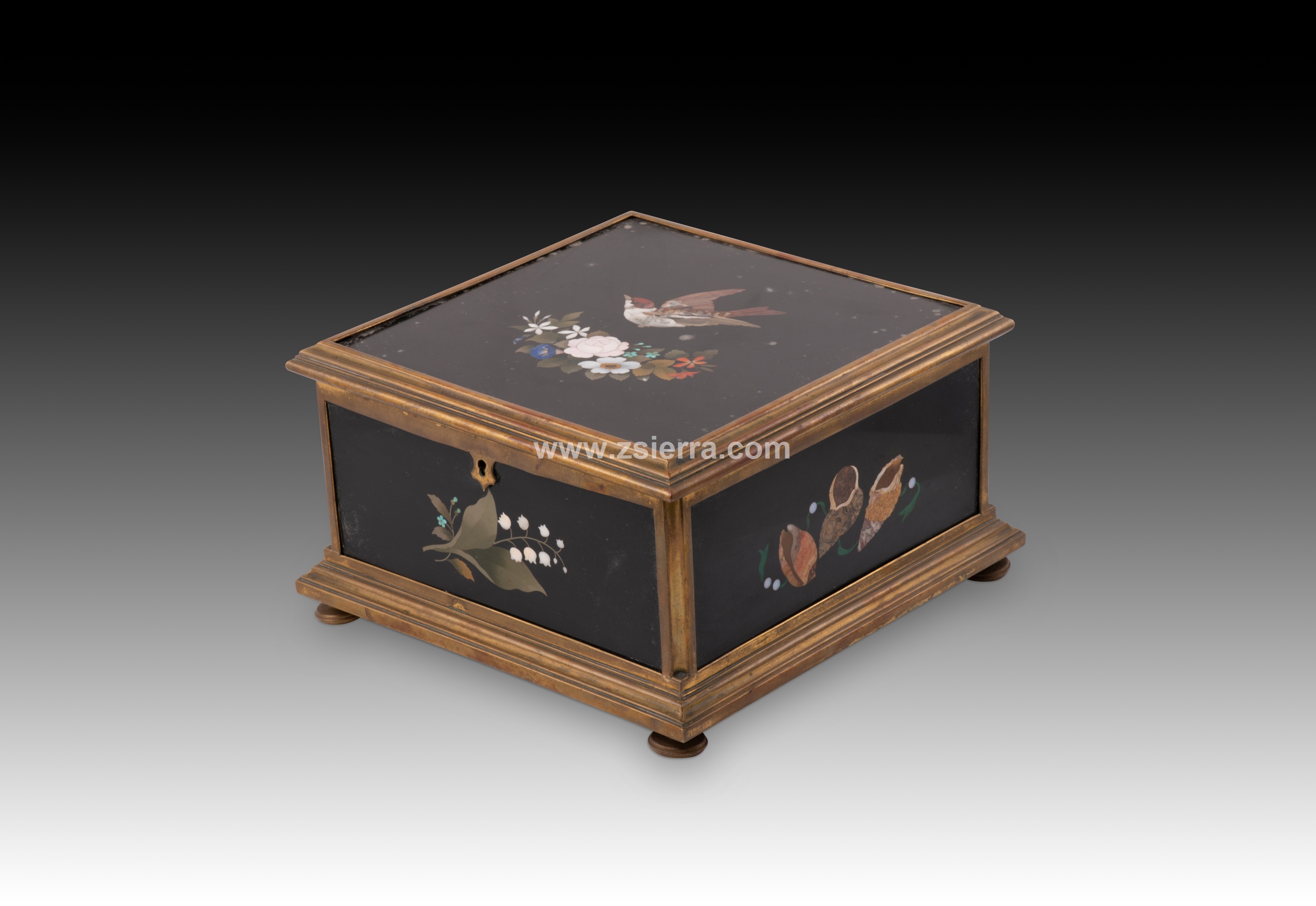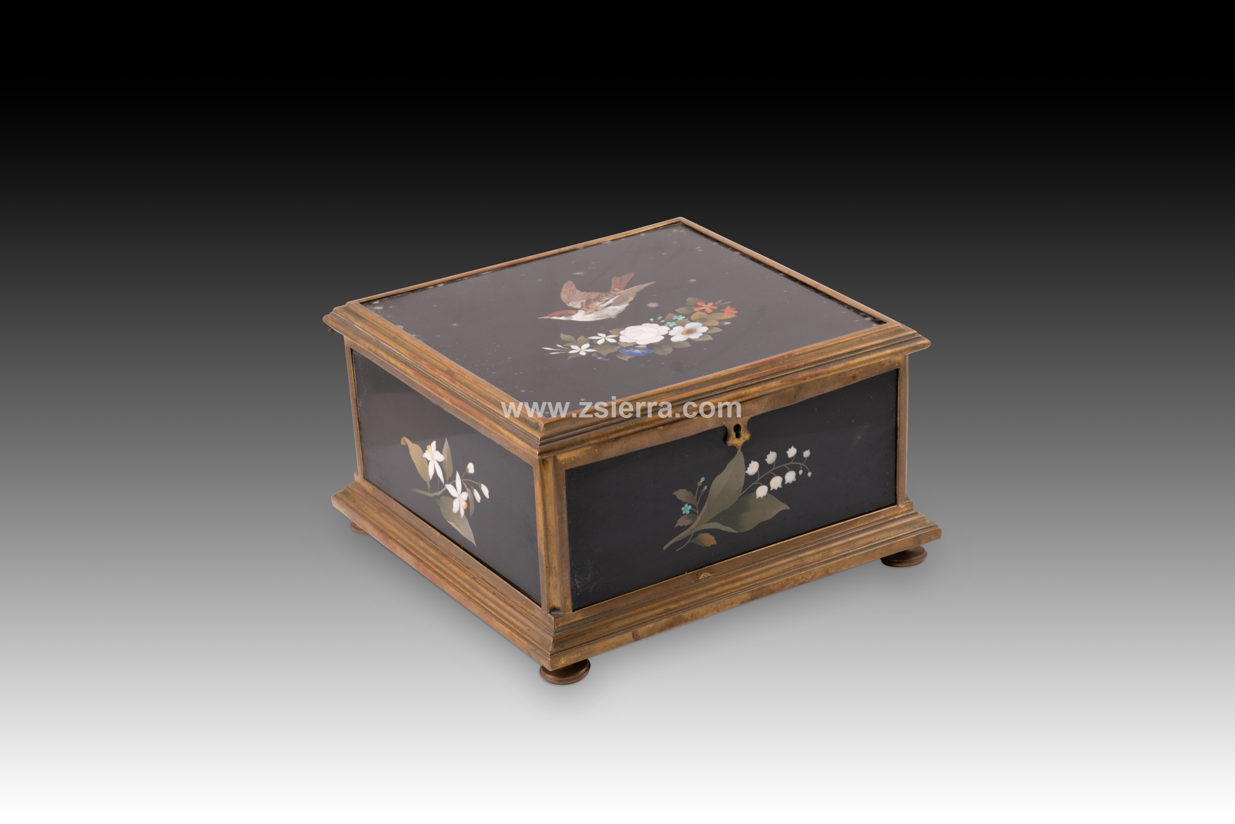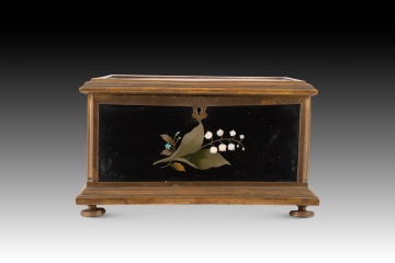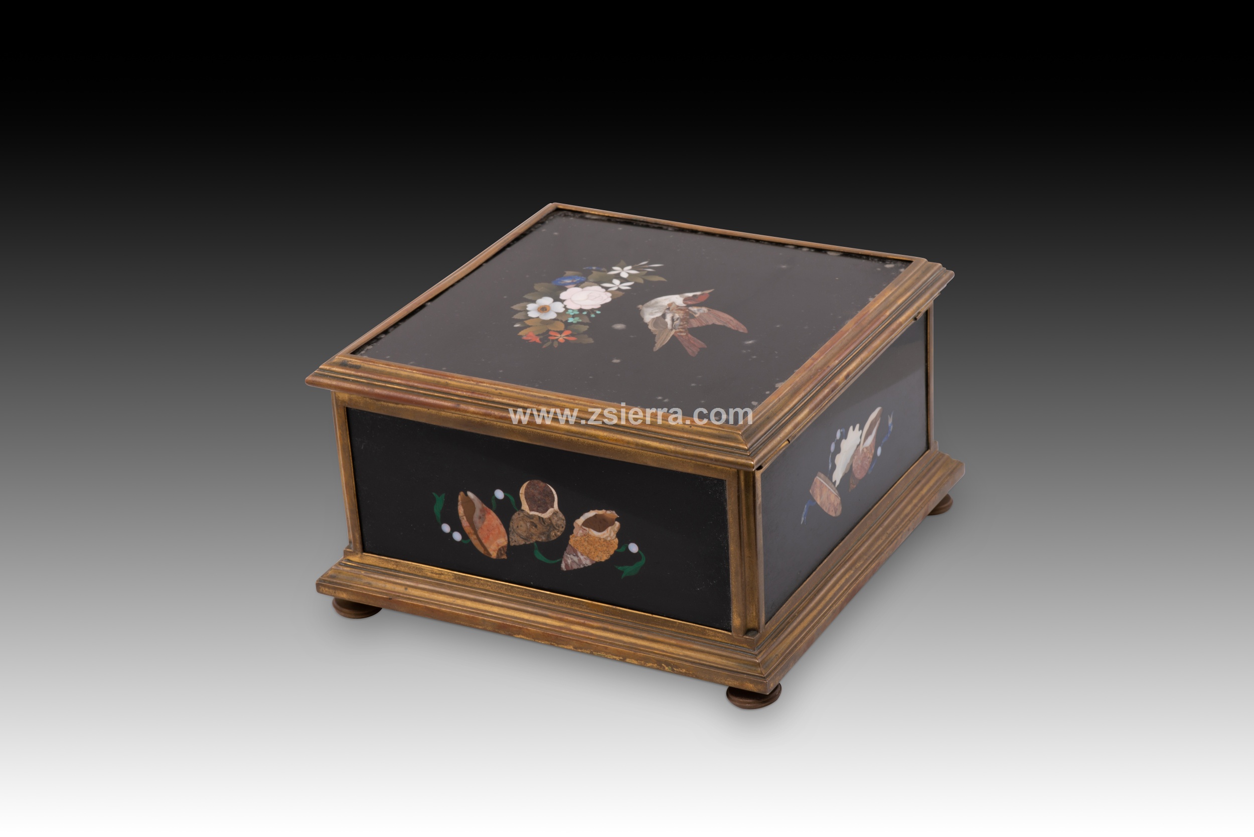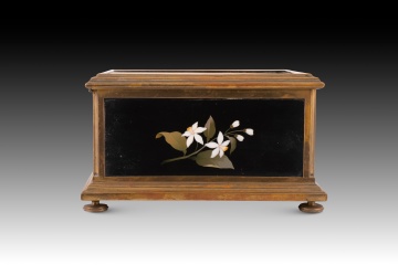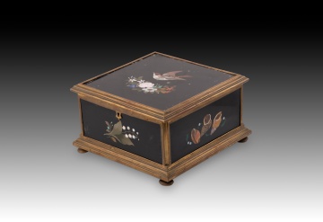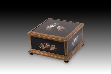Caja o arqueta cuadrada con tapa plana y apoyo sobre cuatro patas circulares decorada en la tapa y laterales con placas de marquetería de piedras durar con elementos florales y animales, y tapizada con textil al interior. Tanto en forma como en decoración sigue de cerca modelos italianos muy habituales durante todo el siglo XIX.
