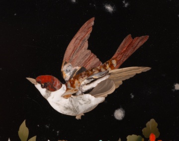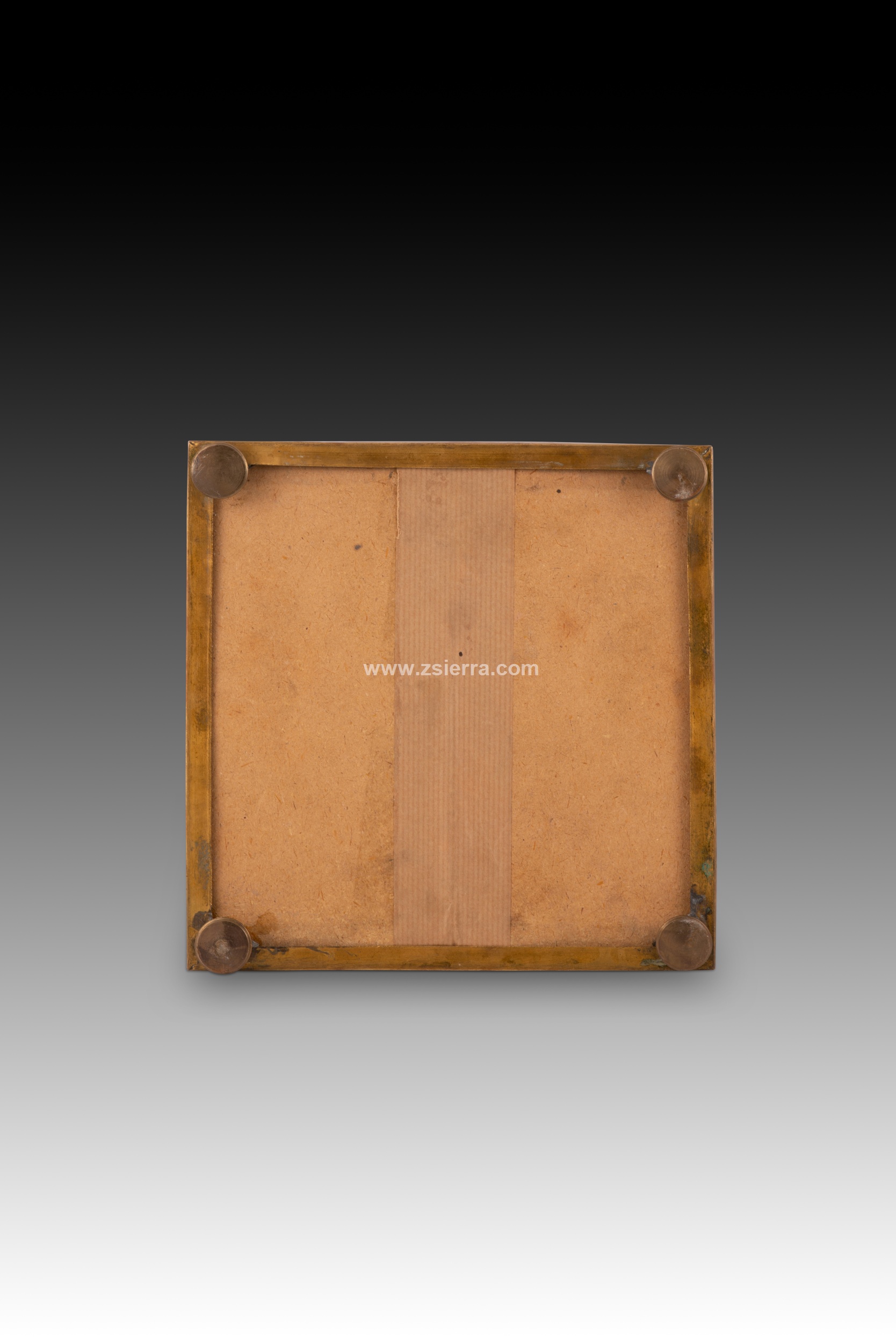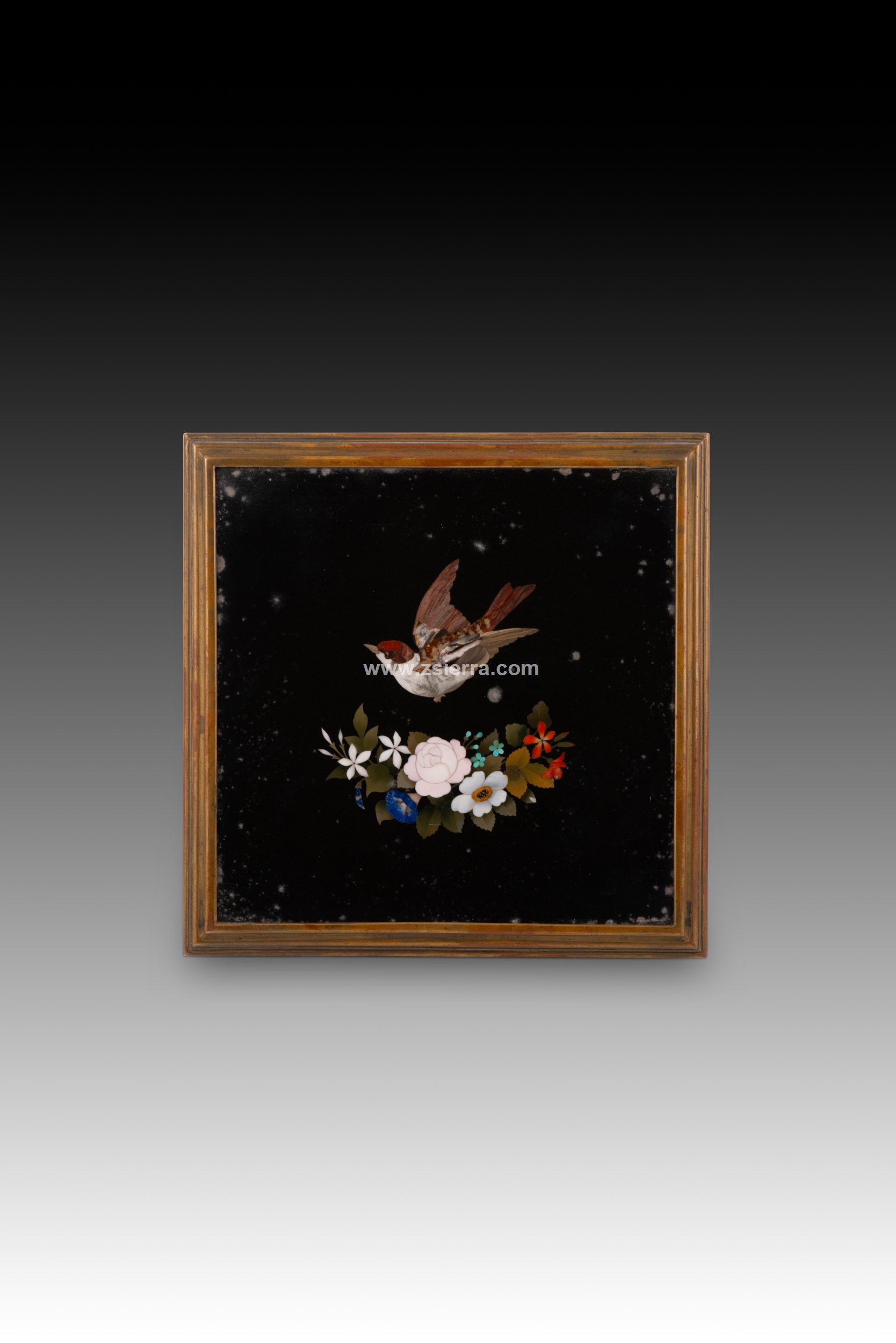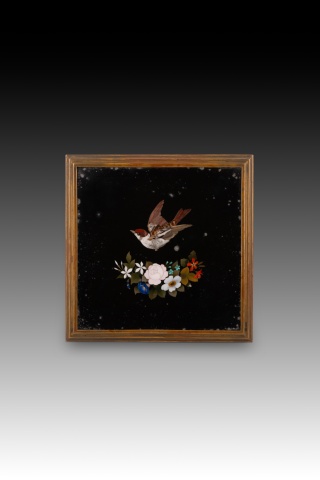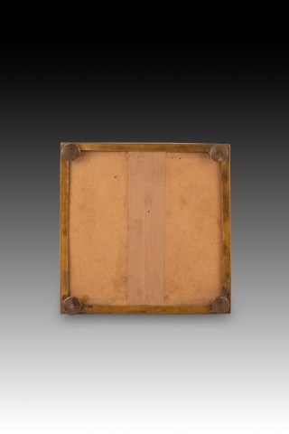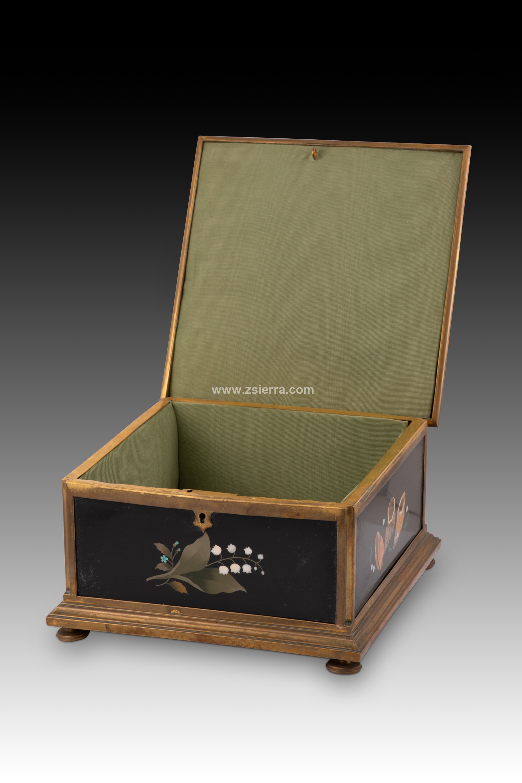 Caja o arqueta cuadrada con tapa plana y apoyo sobre cuatro patas circulares decorada en la tapa y laterales con placas de marquetería de piedras durar con elementos florales y animales, y tapizada con textil al interior. Tanto en forma como en decoración sigue de cerca modelos italianos muy habituales durante todo el siglo XIX.