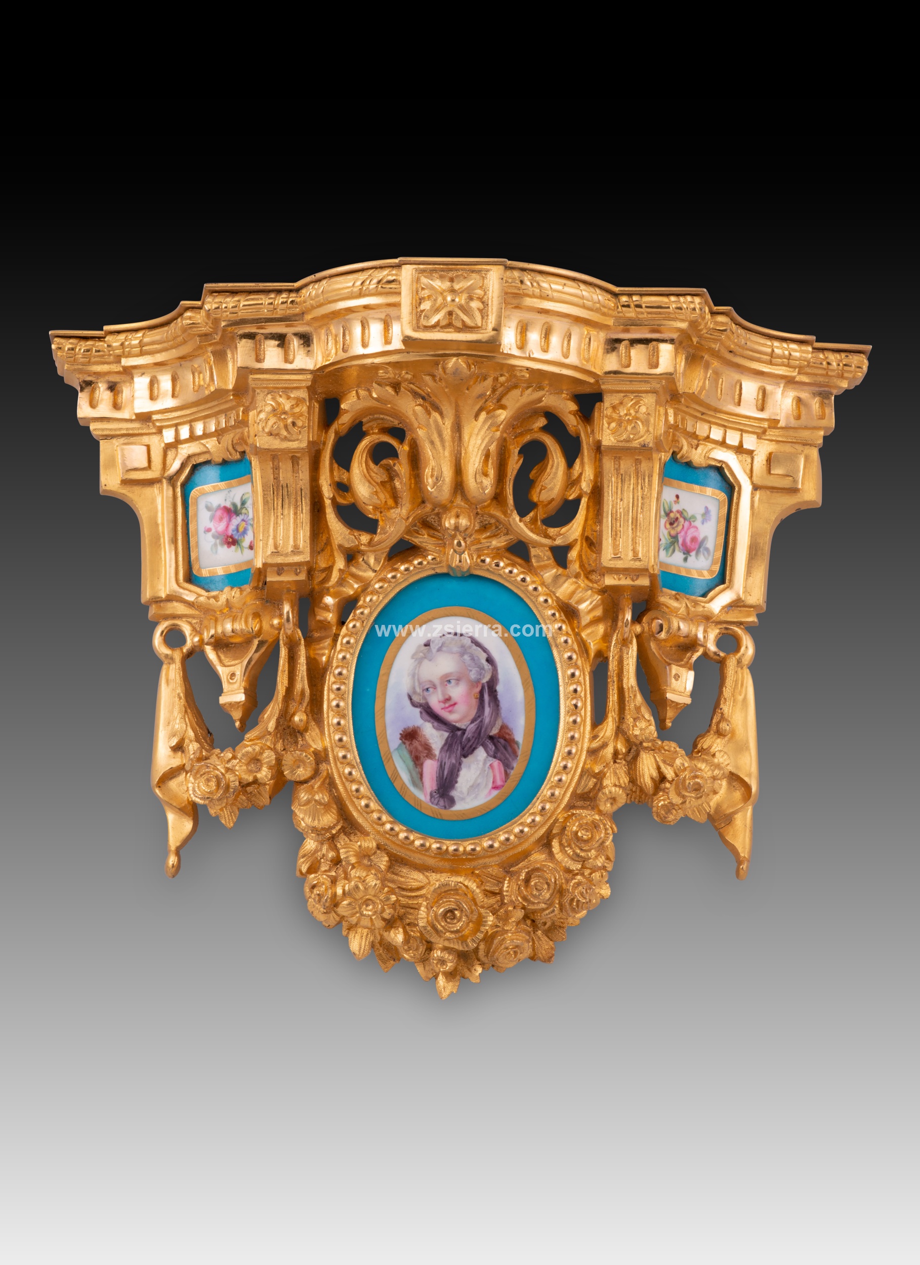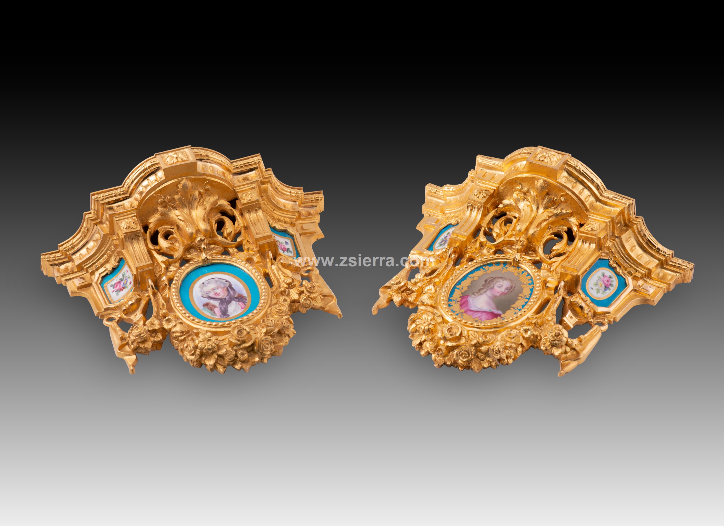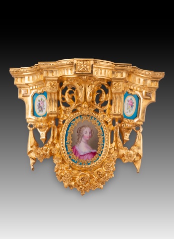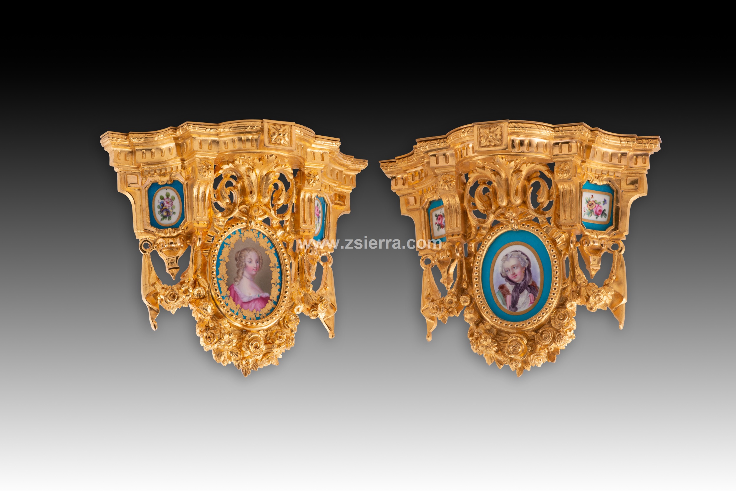 Pareja de pequeñas estanterías para fijar en una pared realizadas en bronce dorado decorado con elementos en relieve de clara inspiración clasicista (motivos arquitectónicos, roleos, molduras acanaladas, guirnaldas de rosas, lazos, etc.) siguiendo corrientes habituales en la escuela francesa del siglo XIX. En cada una aparecen tres placas de porcelana esmaltada decorada siguiendo colores y formas comunes en la fábrica de Sevres (Manufacture nationale de Sèvres): dos con un medallón con flores y la zona en torno a él en azul (los cuatro distintos), otro más grande y dispuesto en el centro de la pieza con un medallón con un retrato femenino (los dos diferentes, uno con una joven y un marco de flores doradas; el otro con otra dama con los cabellos cubiertos y un marco liso en dorado). Nótese que, al dorso, estos medallones y placas no cuentan con marcas y presentan algunas faltas no apreciables en el frente.