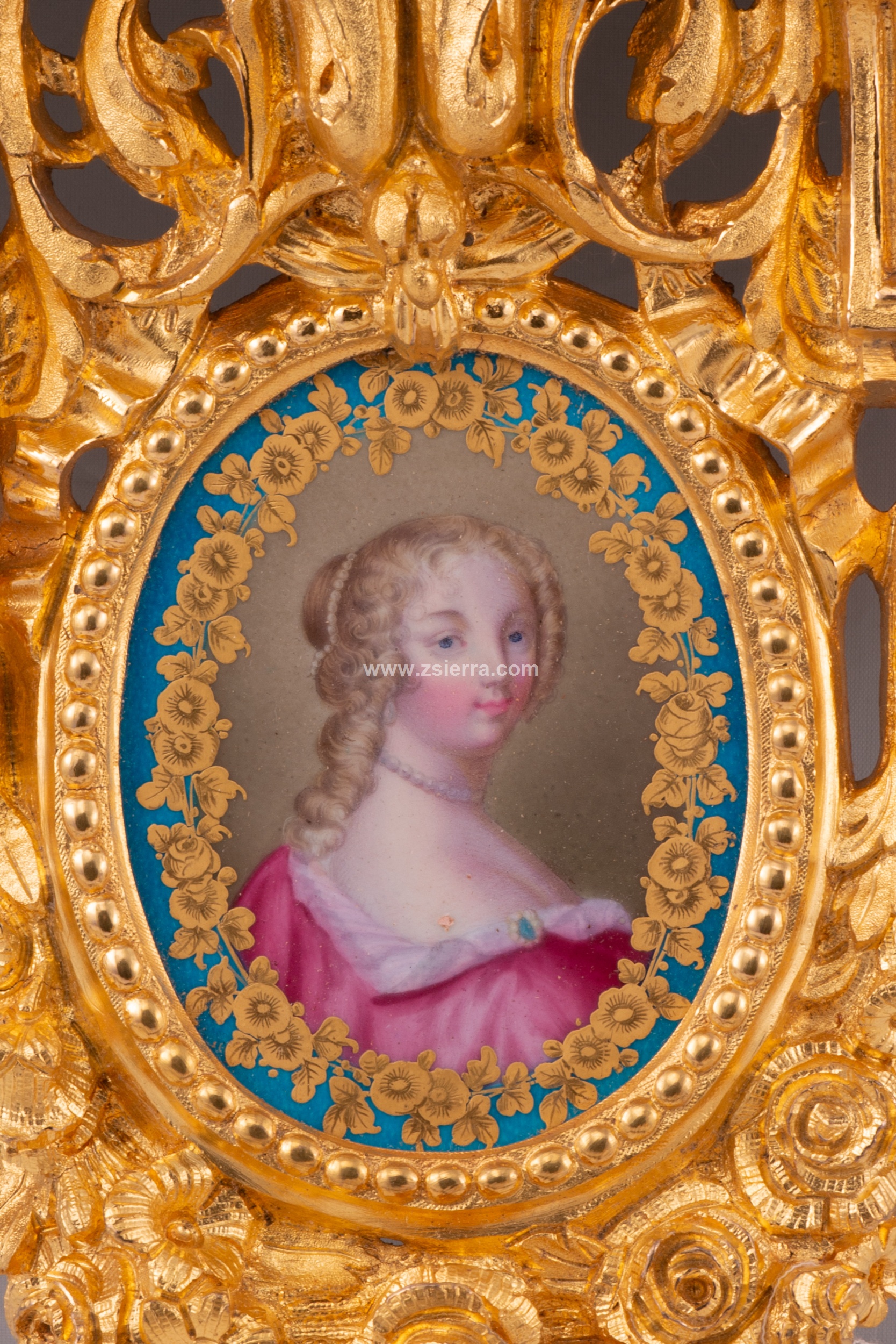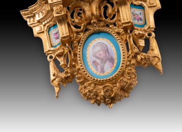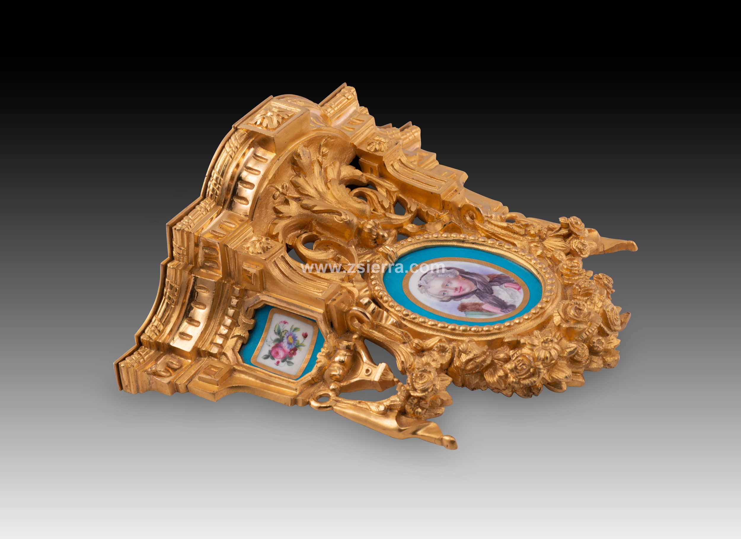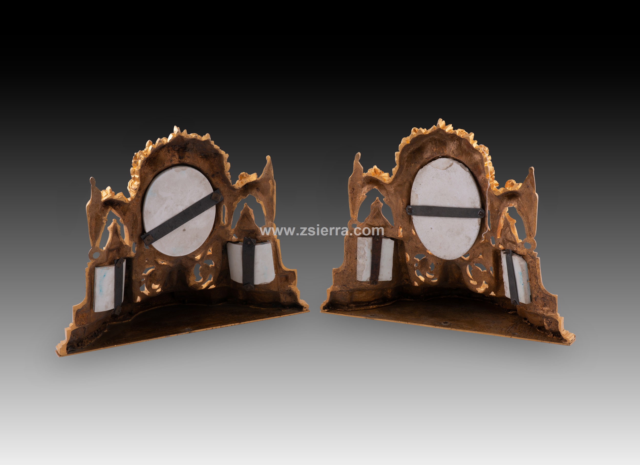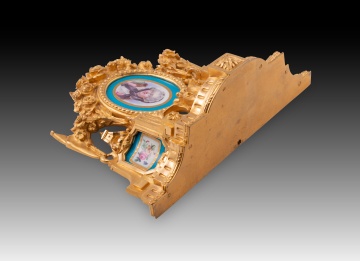Pareja de pequeñas estanterías para fijar en una pared realizadas en bronce dorado decorado con elementos en relieve de clara inspiración clasicista (motivos arquitectónicos, roleos, molduras acanaladas, guirnaldas de rosas, lazos, etc.) siguiendo corrientes habituales en la escuela francesa del siglo XIX. En cada una aparecen tres placas de porcelana esmaltada decorada siguiendo colores y formas comunes en la fábrica de Sevres (Manufacture nationale de Sèvres): dos con un medallón con flores y la zona en torno a él en azul (los cuatro distintos), otro más grande y dispuesto en el centro de la pieza con un medallón con un retrato femenino (los dos diferentes, uno con una joven y un marco de flores doradas; el otro con otra dama con los cabellos cubiertos y un marco liso en dorado). Nótese que, al dorso, estos medallones y placas no cuentan con marcas y presentan algunas faltas no apreciables en el frente.