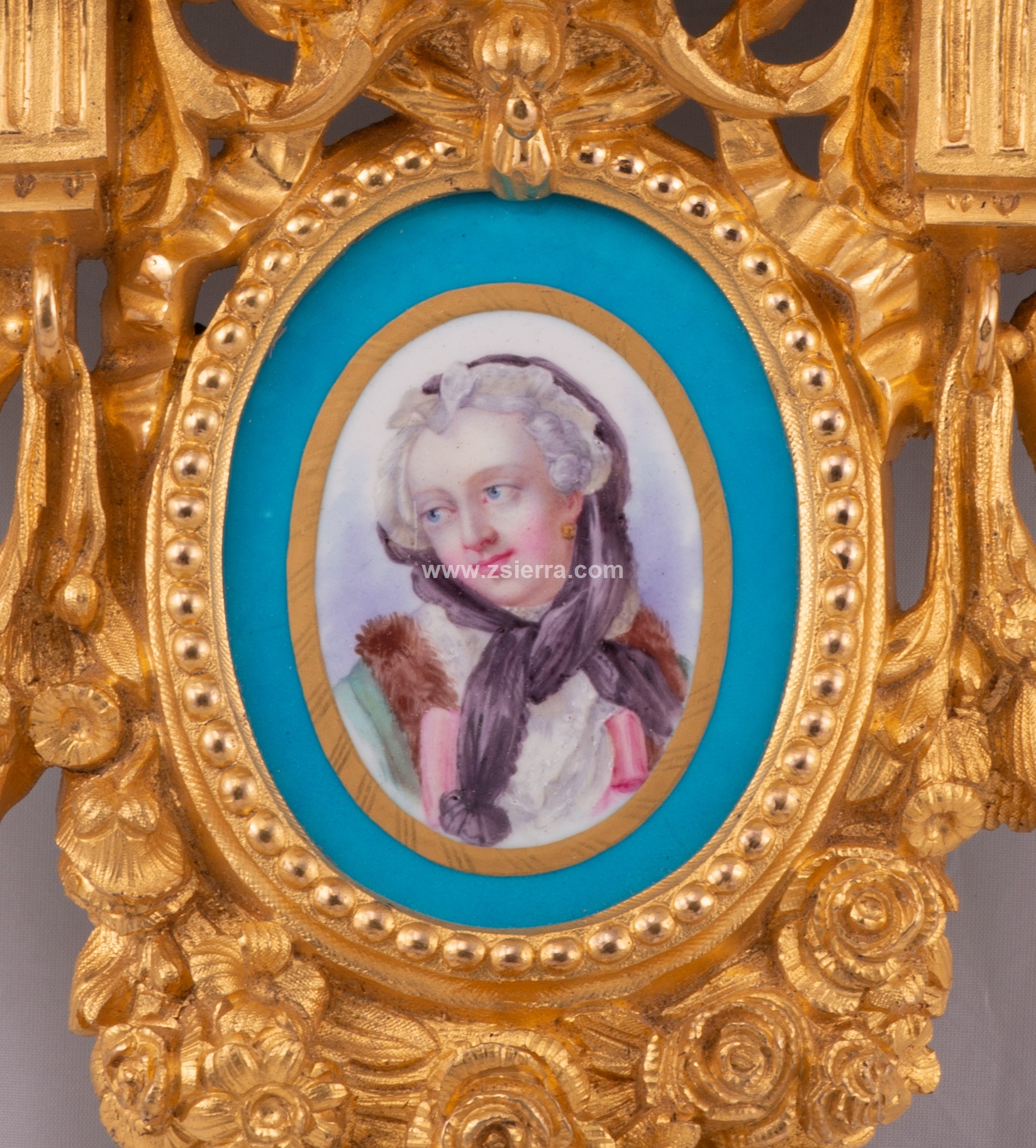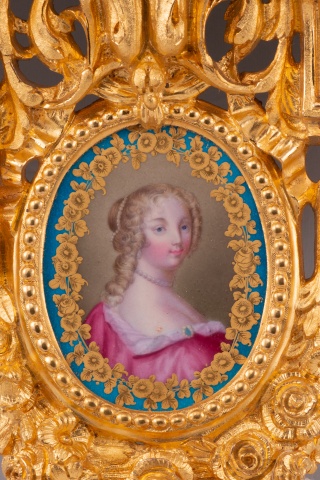 Como es habitual en este tipo de piezas decorativas de escuela francesa, se tiene constancia de otros ejemplos similares, variando en las damas de los medallones de porcelana y en el número de placas de este material con que cuentan las peanas. Peso: 1,87 kg. y 1,86 kg.